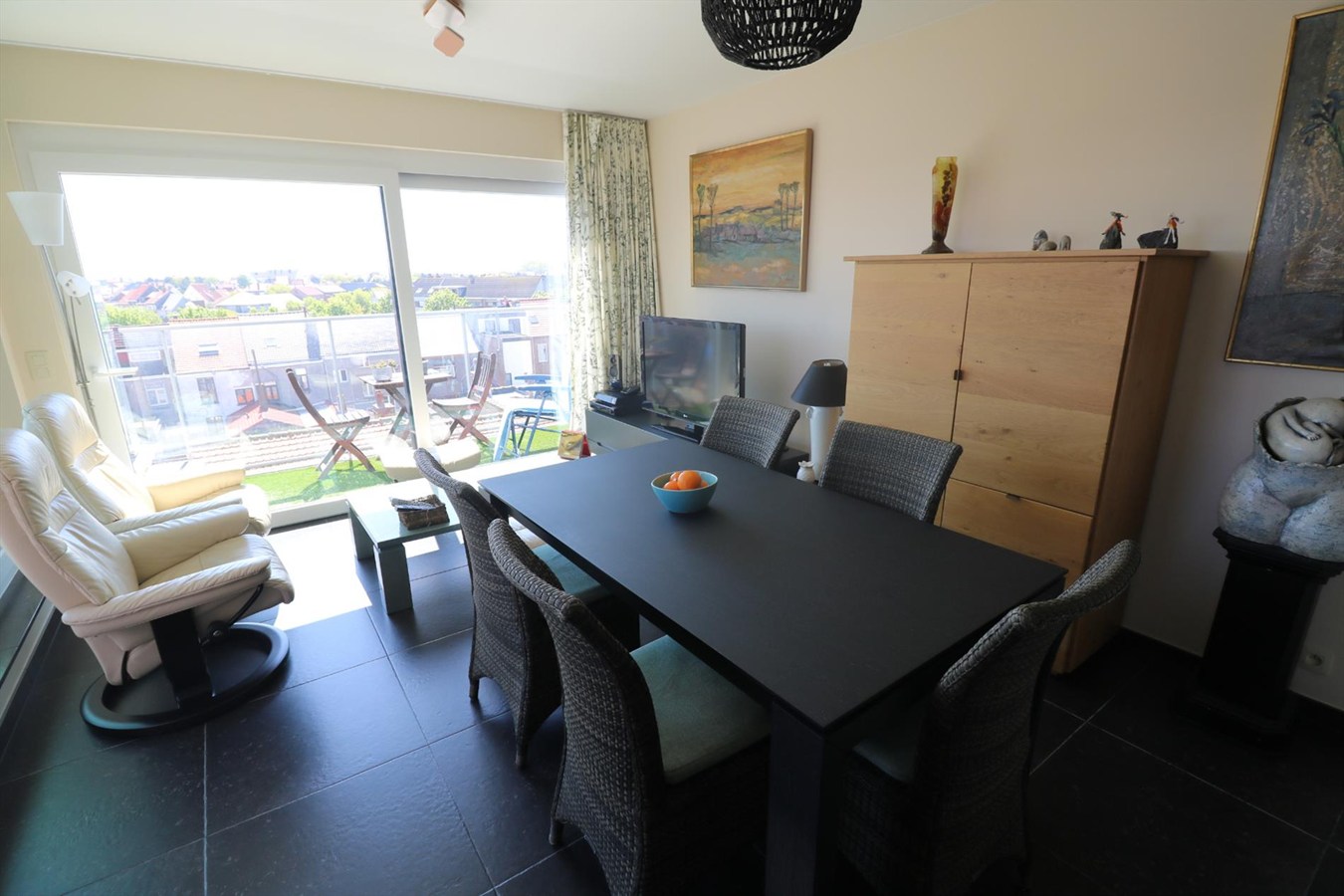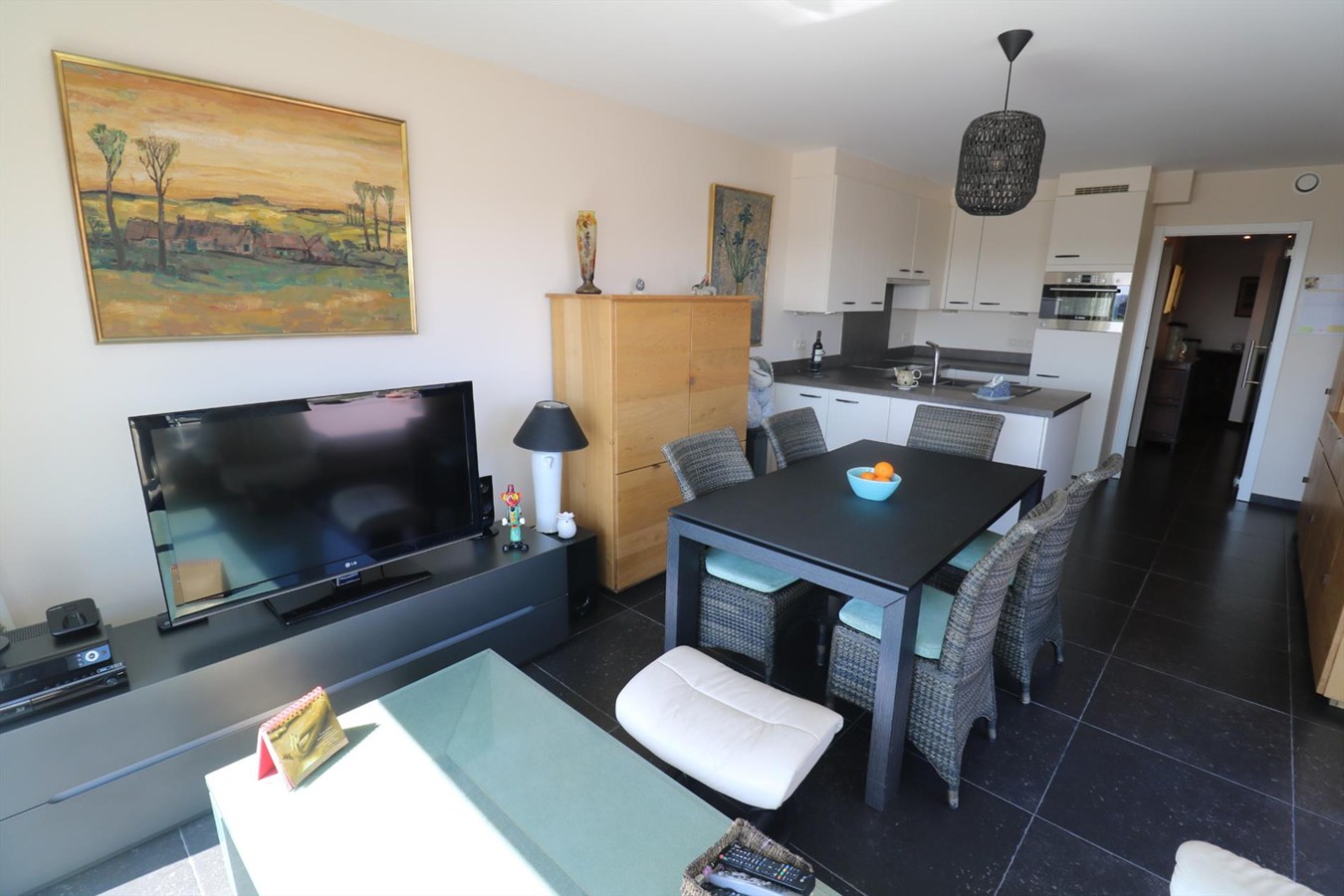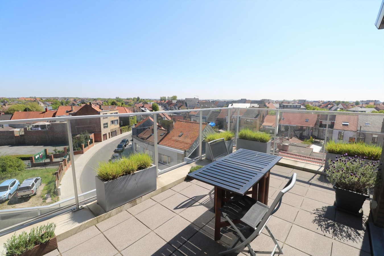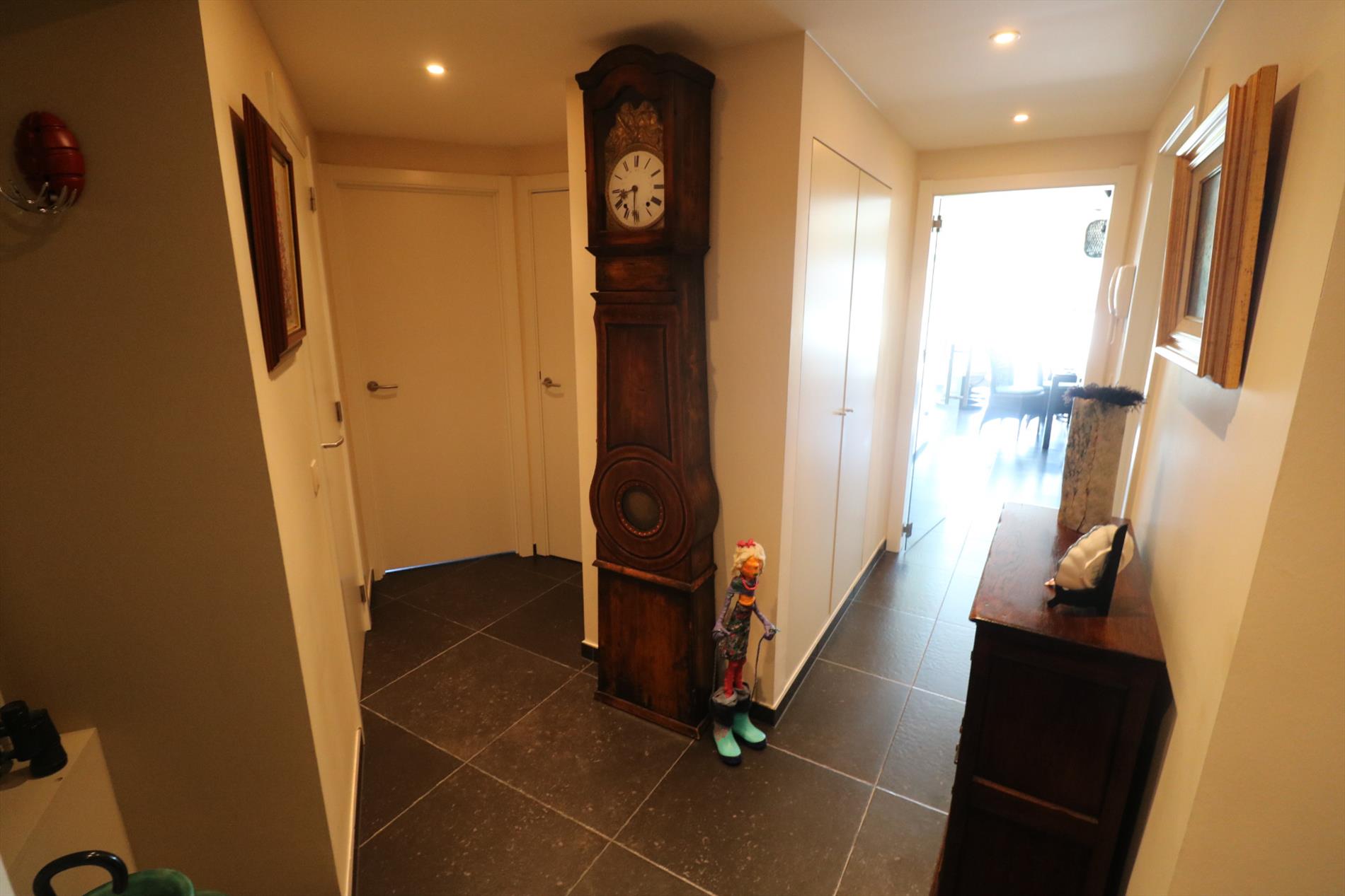 inkomhal met vestiaire, zeer luchtige & zongerichte living met aansluitend ruime zonneterrassen met een magnifiek open zicht op het hinterland, volledig ingerichte open keuken, berging, badkamer met lavabomeubel, ligbad en stortbad, 2 slaapkamers, afzonderlijk toilet.