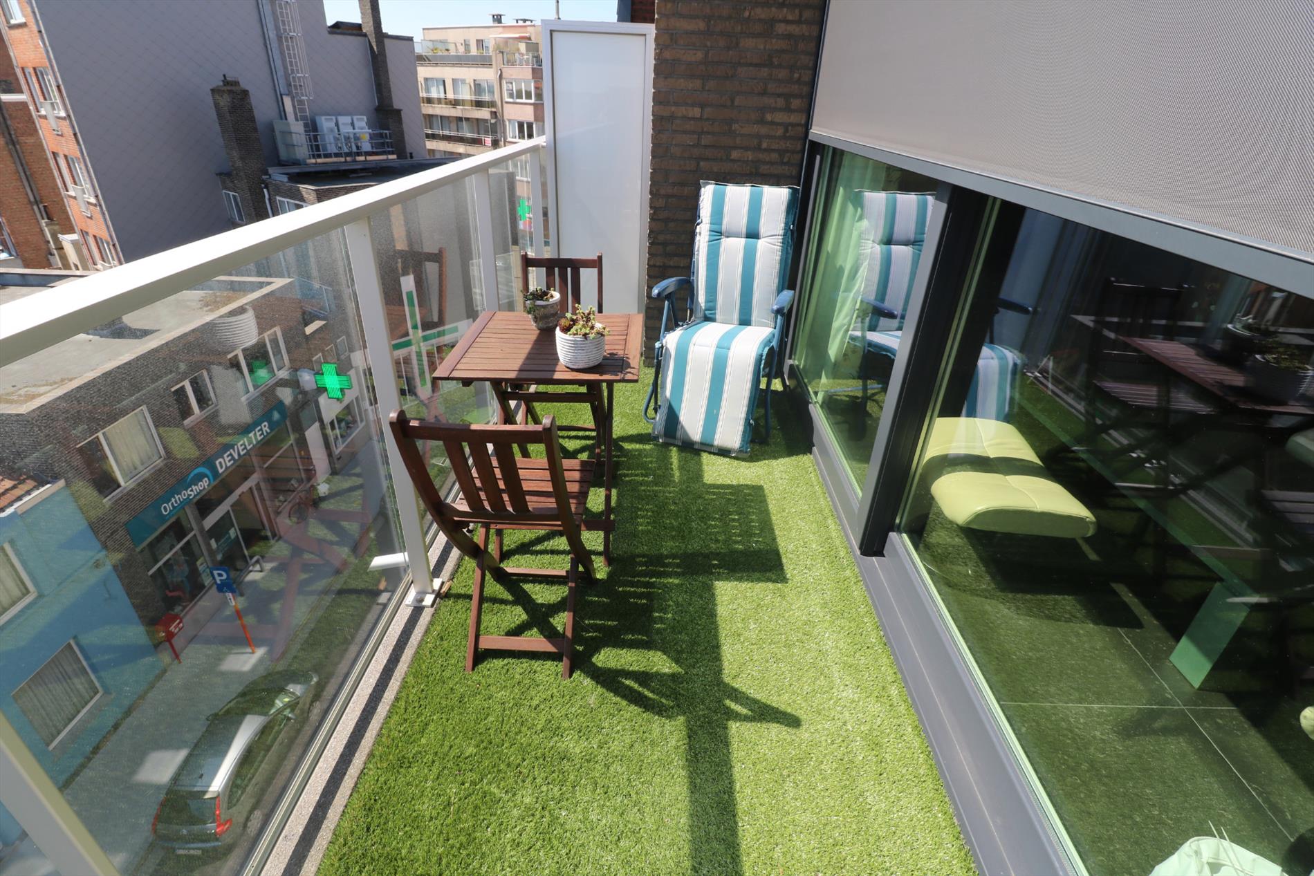 In de living is een elektrische zonneluifel en een elektrische zonnescreen voorzien. Het ganse appartement is voorzien van vloerverwarming (aardgas) en vloertegels in natuursteen. Er is een fietsenberging voorzien.