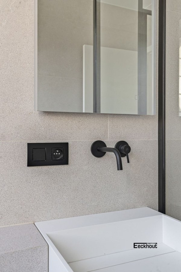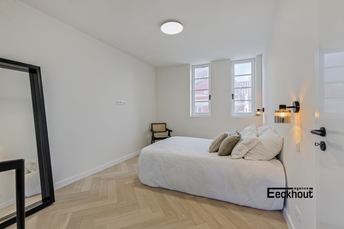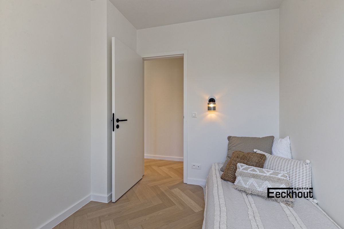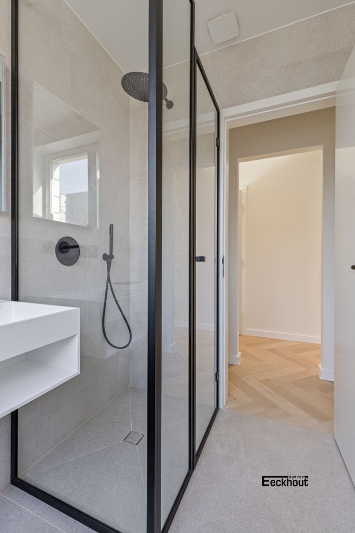 Het appartement werd met moderne luxe-elementen afgewerkt. Denk maar aan een prachtig visgraatparket, gerectificeerde tegels (1m20 x 1m20), een gepantserde veiligheidsdeur, privatieve verwarming (hoogrendementsketels op aardgas met gsm-module op afstand), kleurvideofonie met gsm-module op afstand, design sanitair, inloopdouches op tegelvloer (geen douchebak),