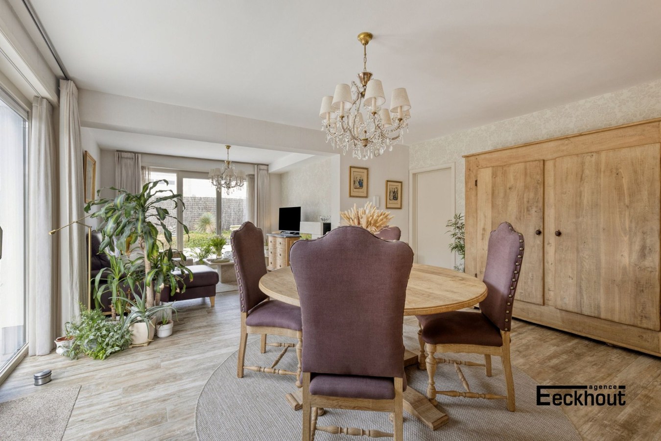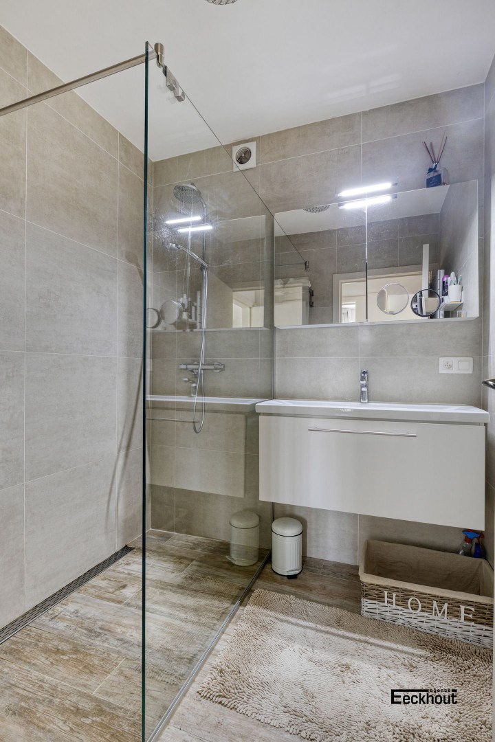 Indeling: inkomhal, afzonderlijk toilet, lichtrijke woonkamer en geïnstalleerde keuken (met vaatwas, combi-oven, keramische kookplaat, koelkast met vriesvak), berging voor wasmachine en droogkast, 2 volwaardige slaapkamers met ingemaakte kasten, badkamer met douche en lavabo, zeer ruim terras/tuin rondom het appartement met tuinhuis, garage die rechtstreeks toegang biedt tot het appartement en oprit.