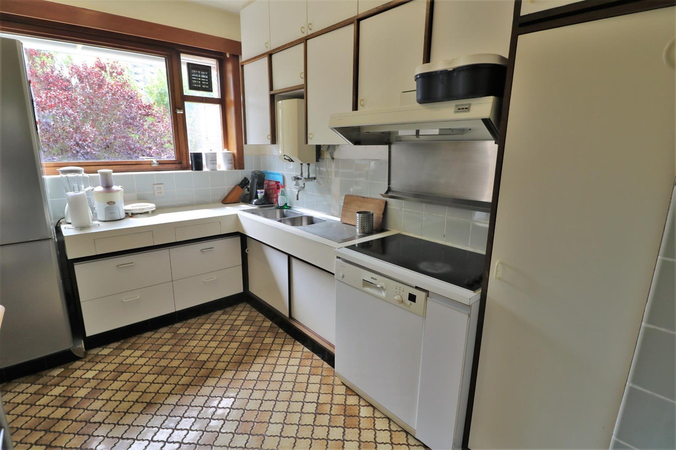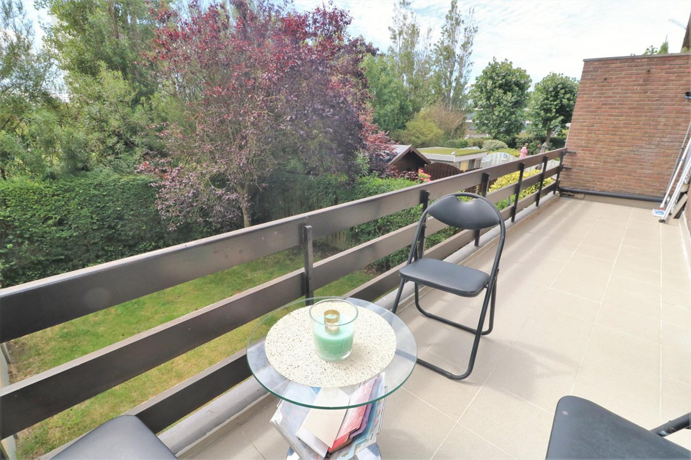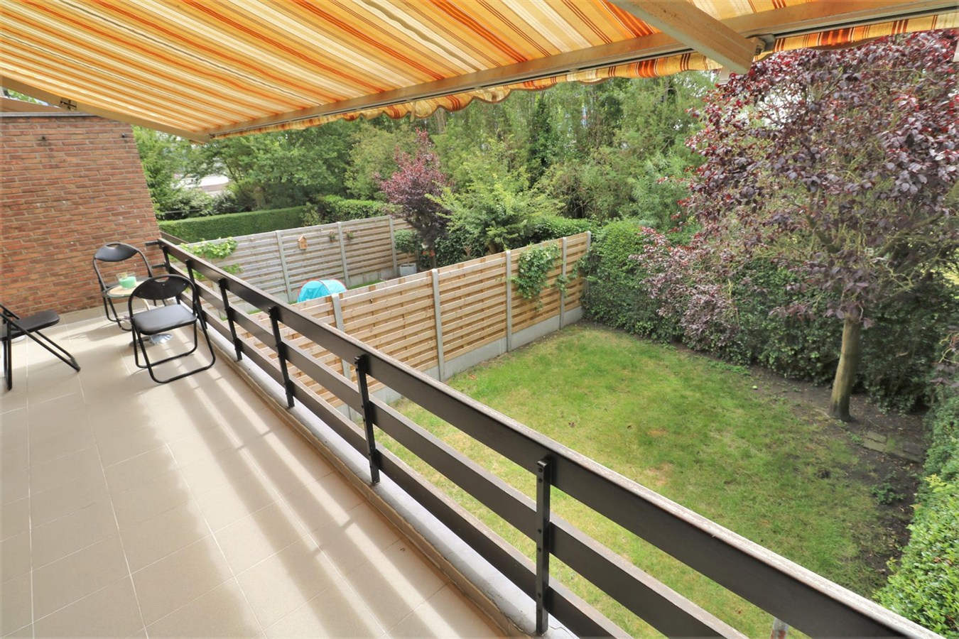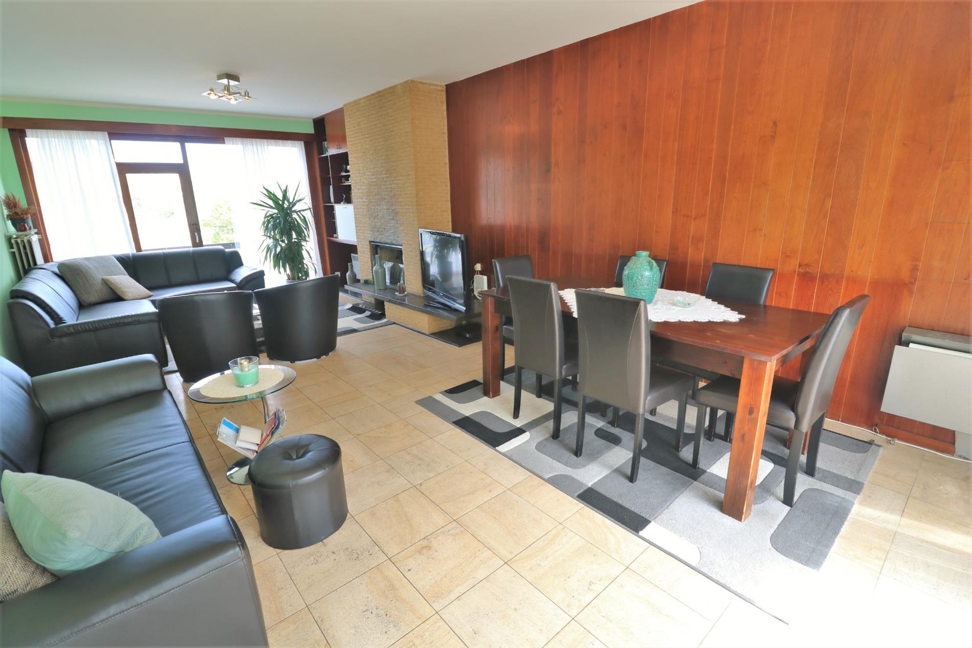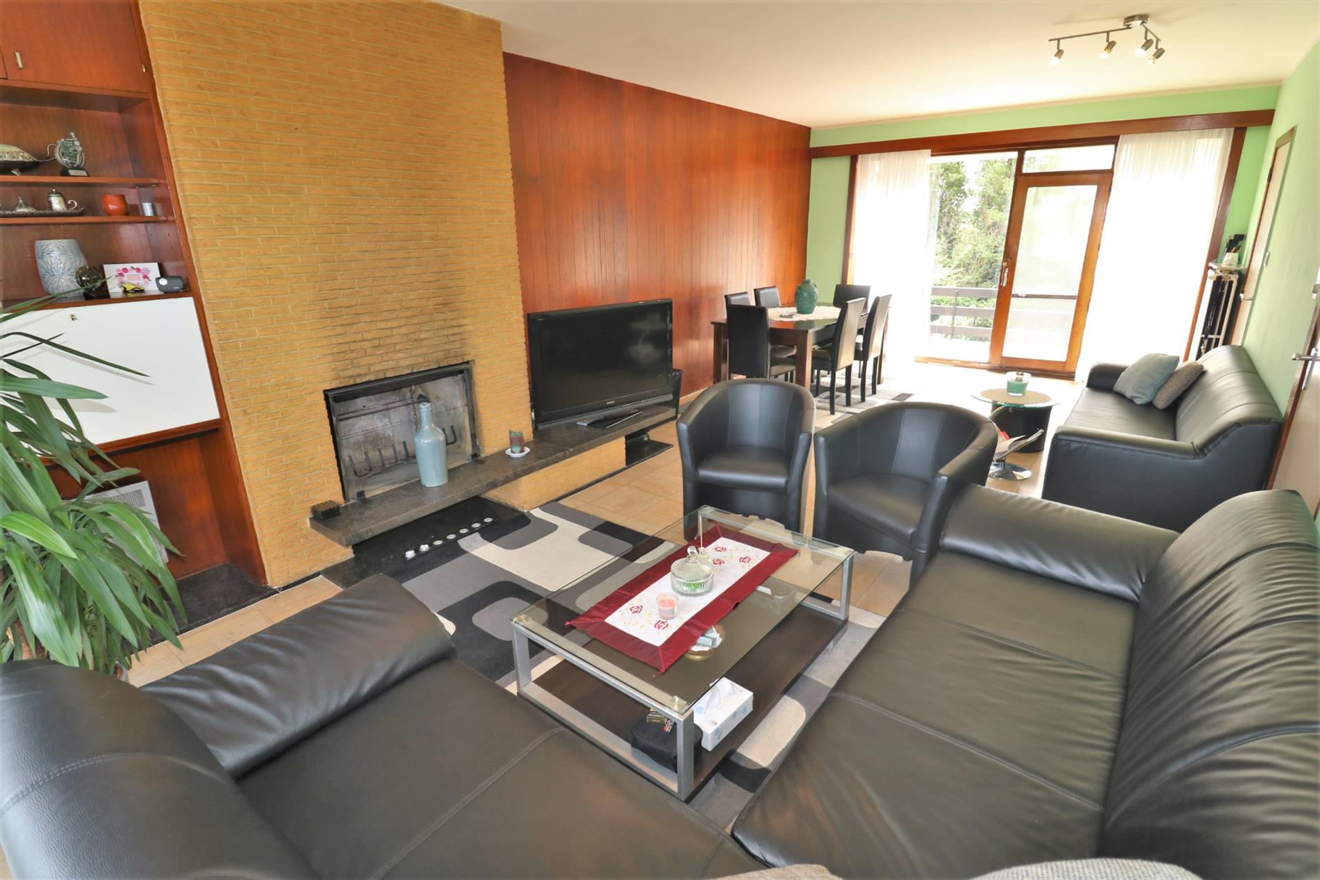 - 1ste verdieping: zeer ruime en zonnige leefruimte met open haard en aansluitende terrassen voor- en achteraan met zonneluifel, gesloten keuken, vestiaireruimte en apart toilet;