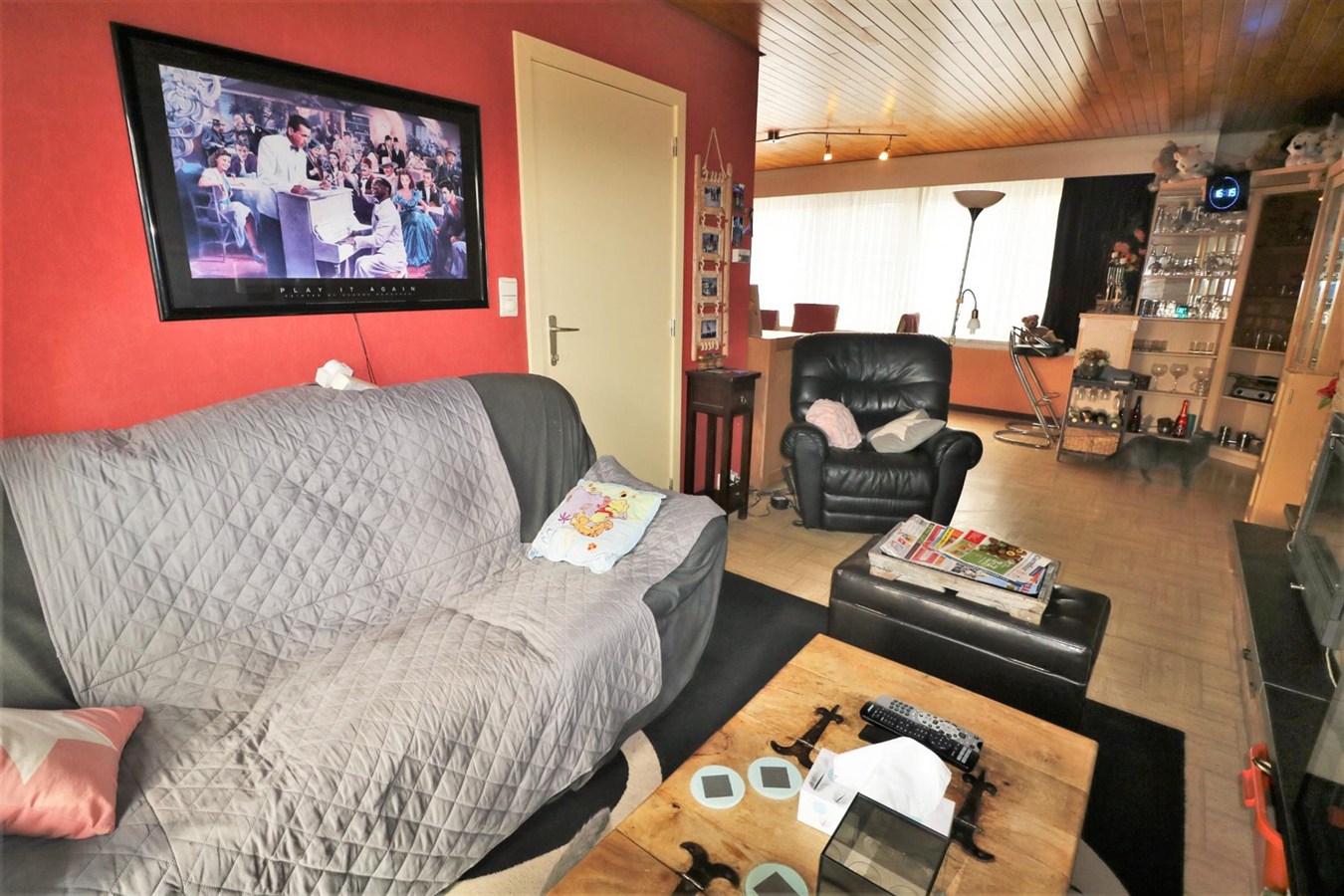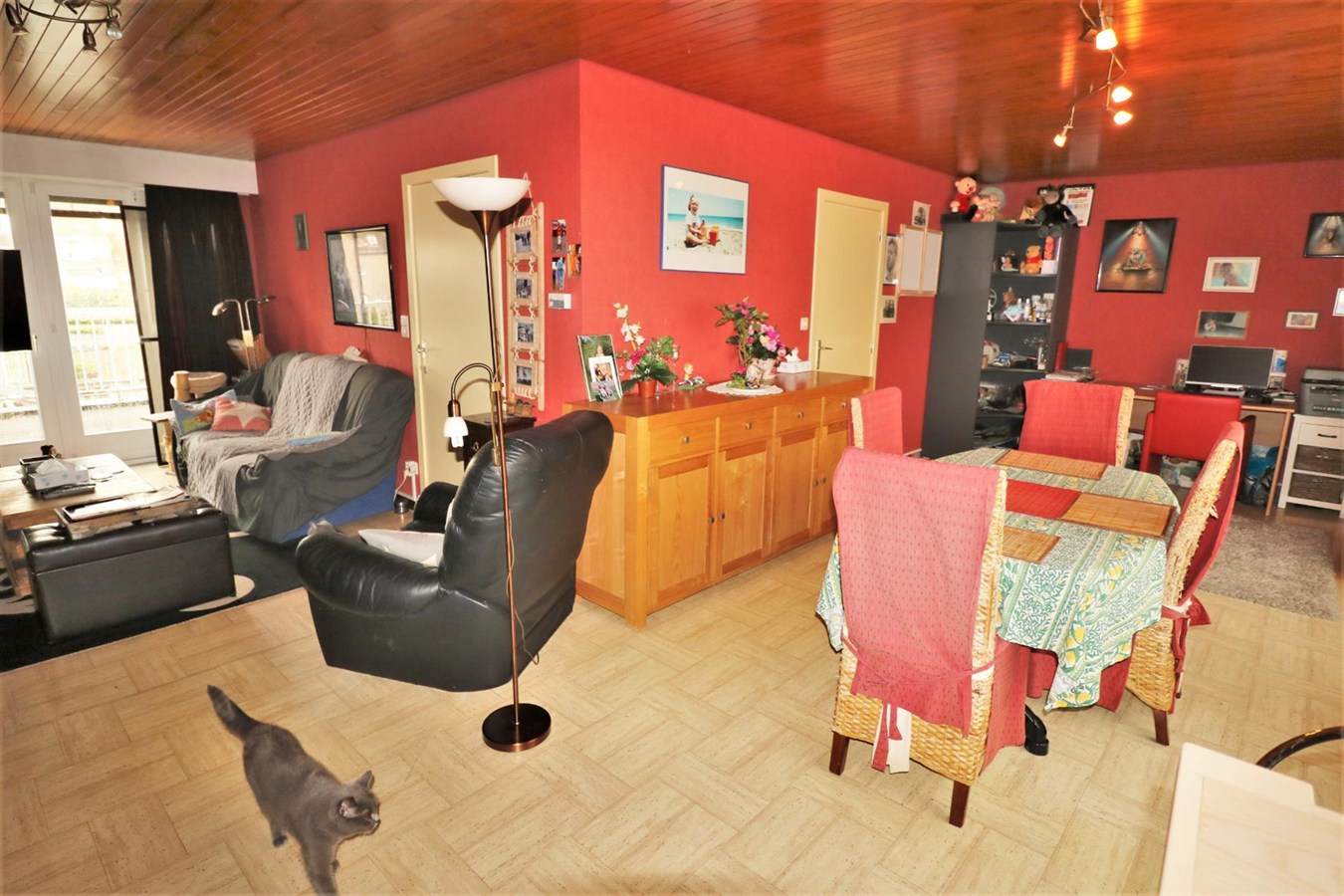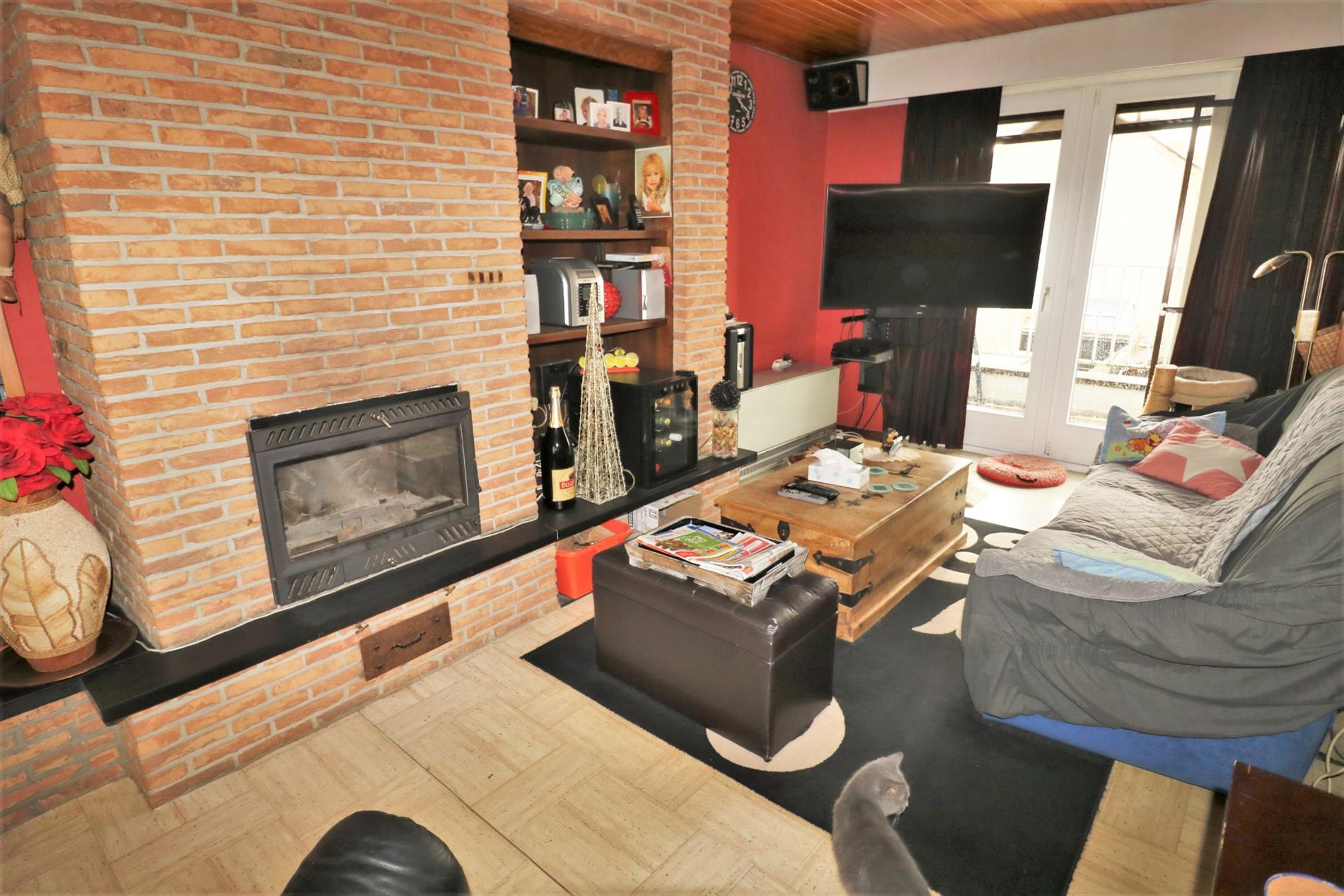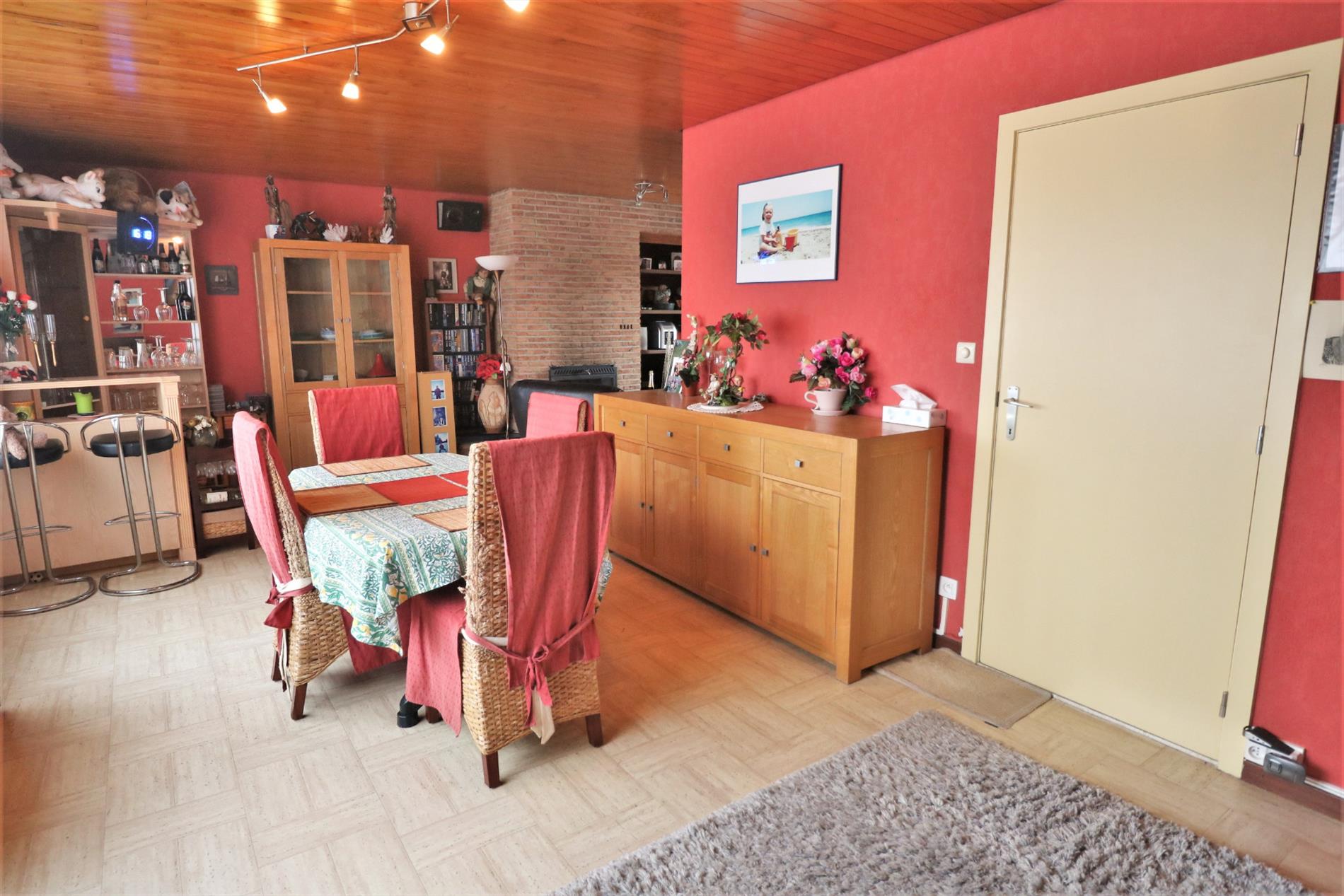 - 1ste verdieping: ruime woonkamer verdeeld in eetplaats en salon voorzien van open haard, gesloten volledig ingerichte keuken met aansluitend terras en toilet;
