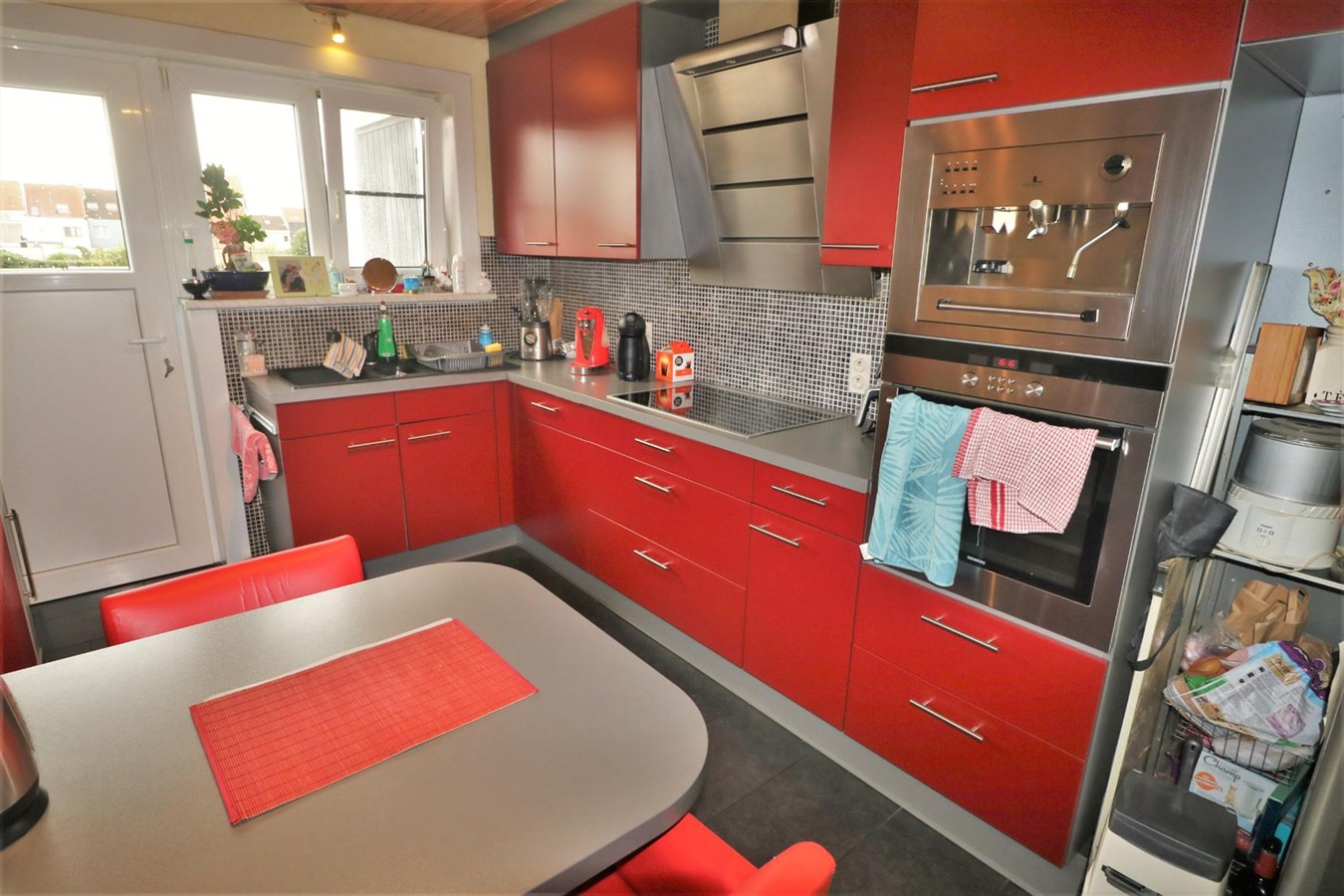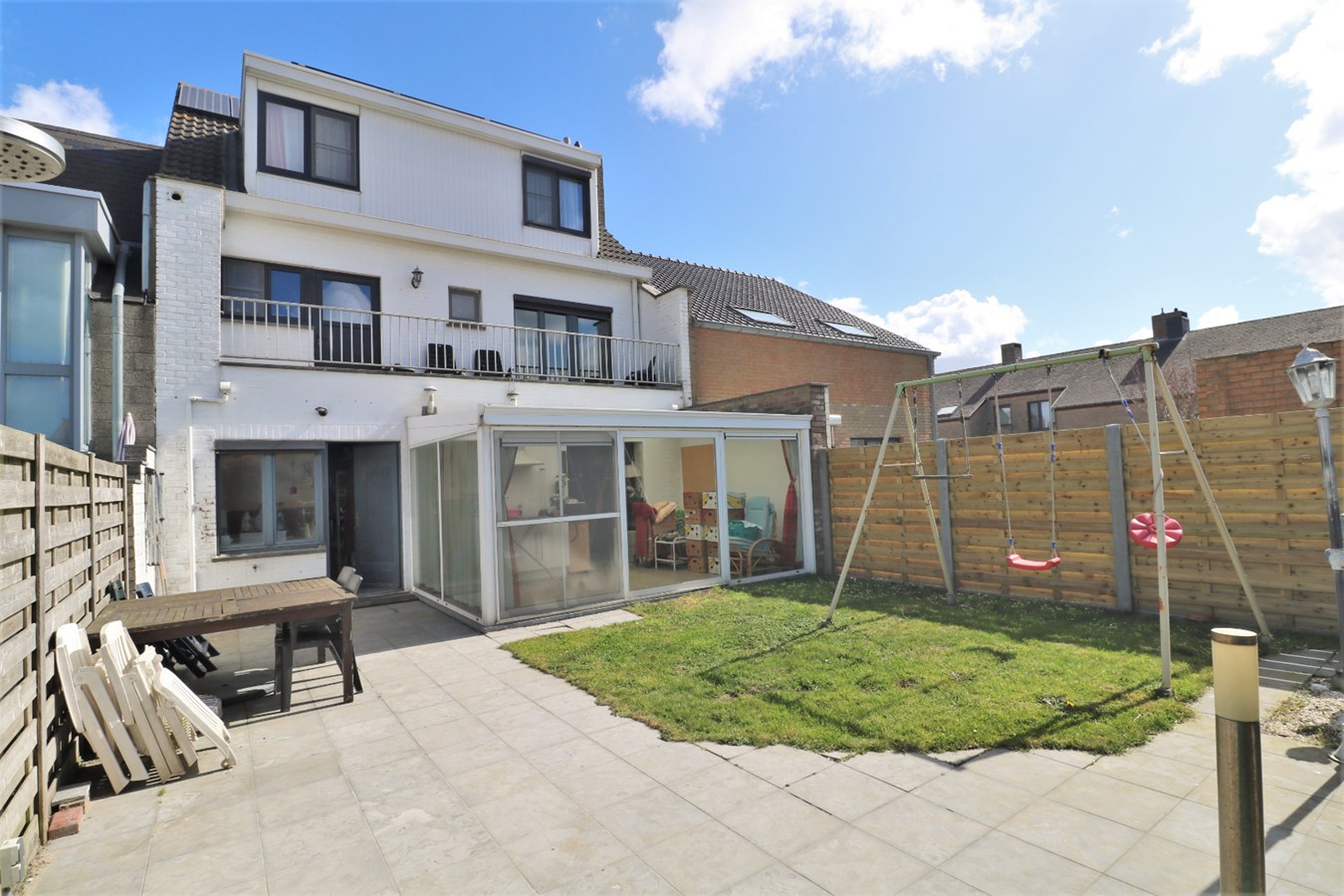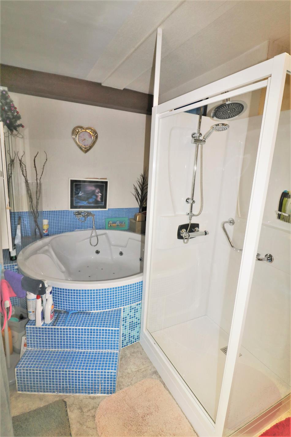 - Gelijkvloers: inkomhal met gastentoilet, grote ruimte (kan ingericht worden als praktijkruimte, welnessruimte, hobbyruimte, ...) met indoor jacuzzi, douchecabine en infraroodsauna, veranda, diepe garage met achterliggende wasruimte en zonnige tuin met bubbelbad en Finse sauna;