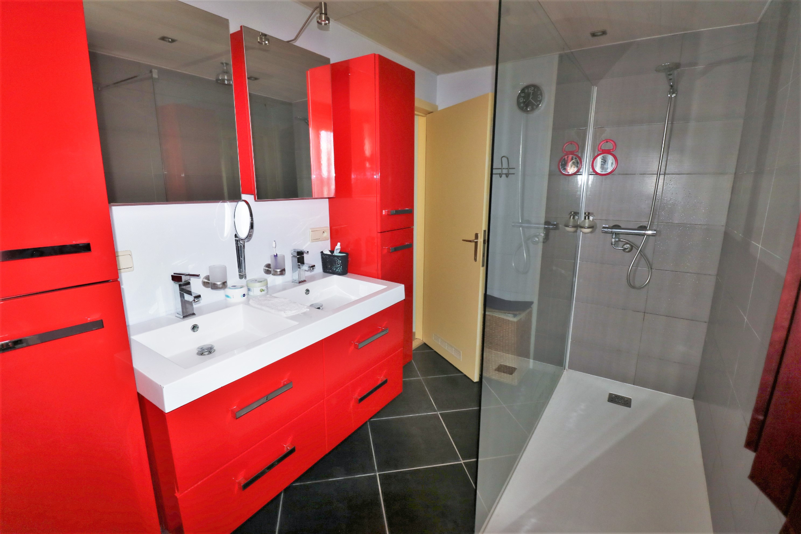 - 2de verdieping: 3 slaapkamers en badkamer met dubbel lavabomeubel, toilet en inloopdouche;