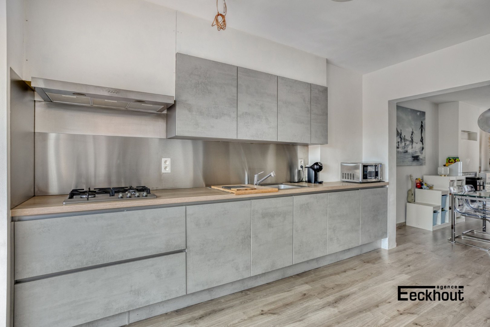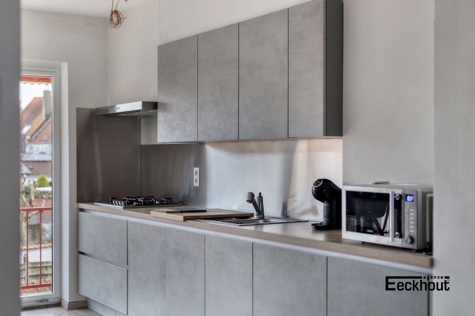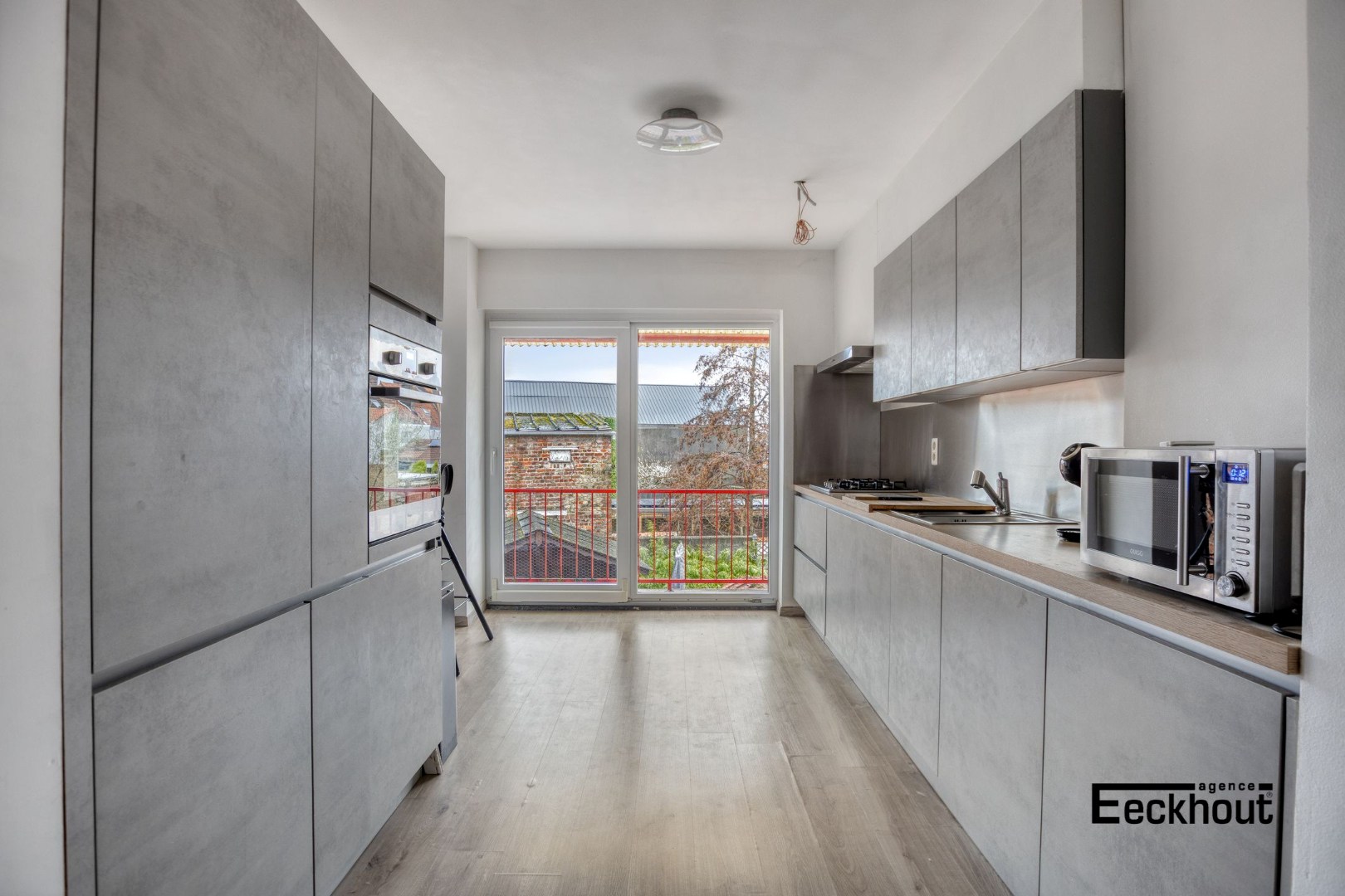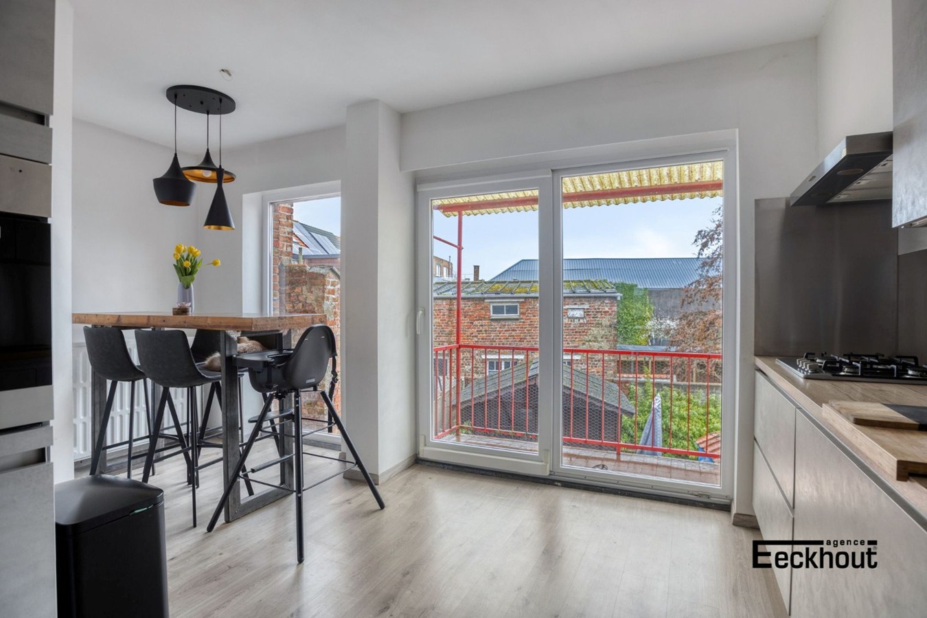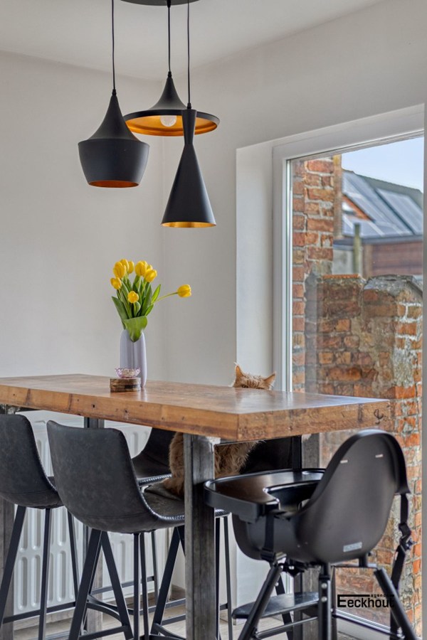 - eerste verdieping: lichtrijke woonkamer met open keuken voorzien van alle toestellen, eethoek met aansluitend terras, toilet;