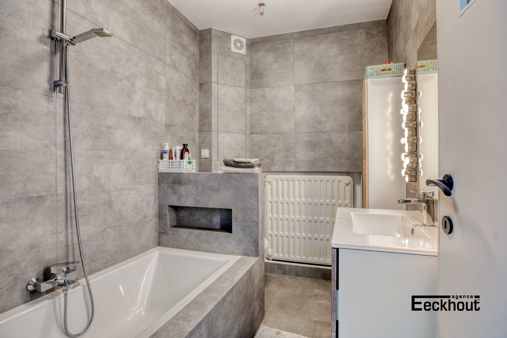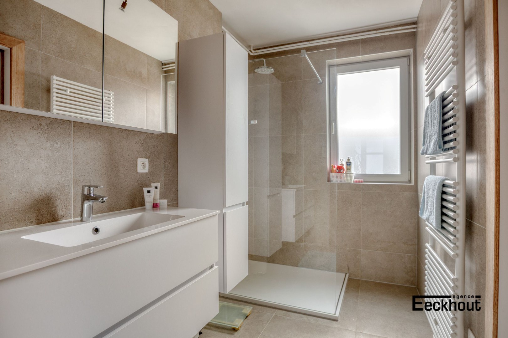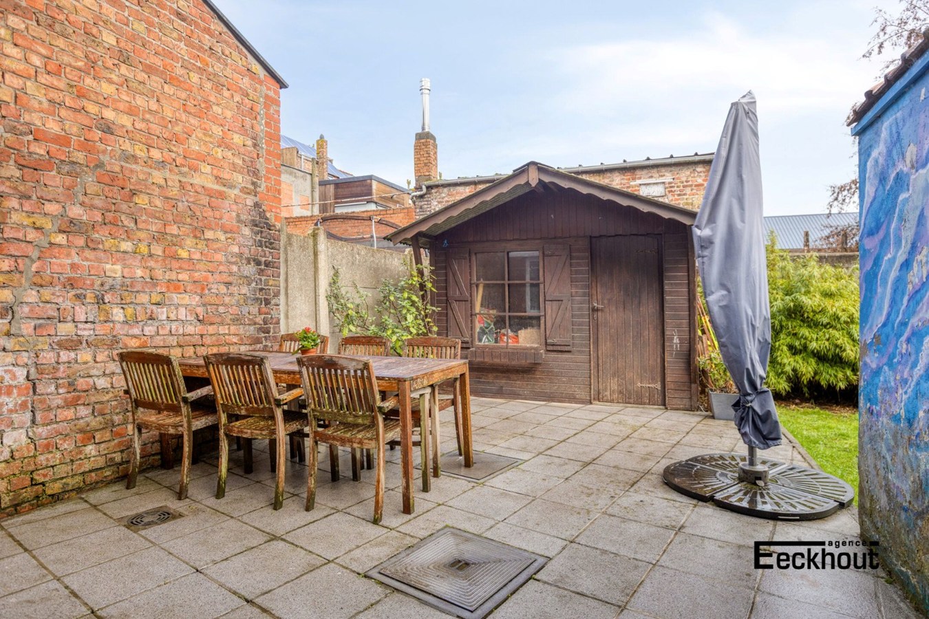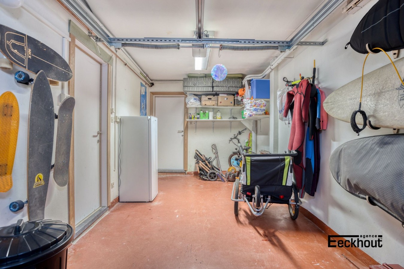 - gelijkvloers: ruime inkomhal met berging onder de trap; garage met automatische, sectionale poort, wasplaats, badkamer met inloopdouche en lavabomeubel, grote tuin in L-vorm met tuinhuis;