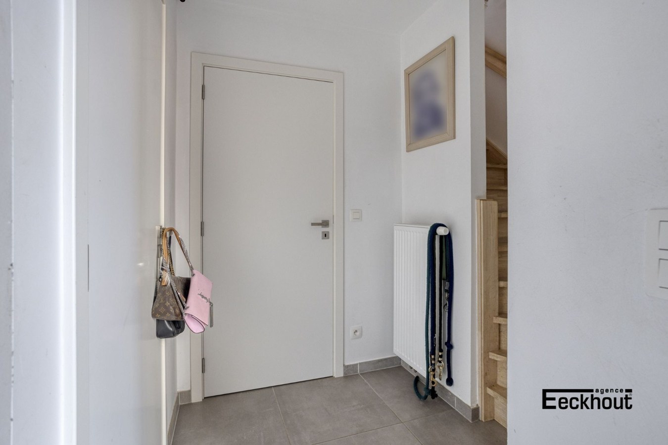 De gelijkvloers inkomhal met aparte wc en berging, geeft toegang via een trap tot de 1e verdieping.
