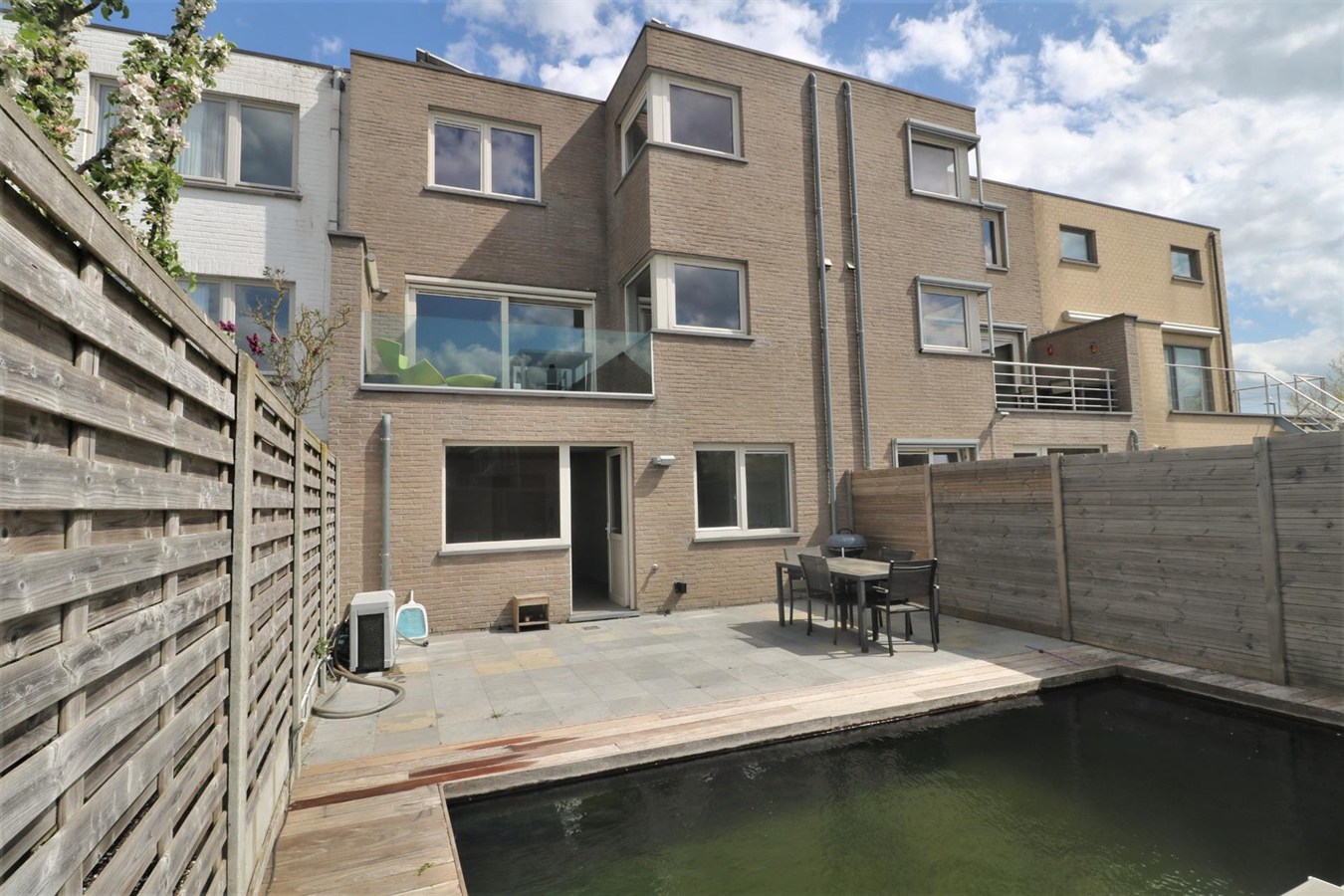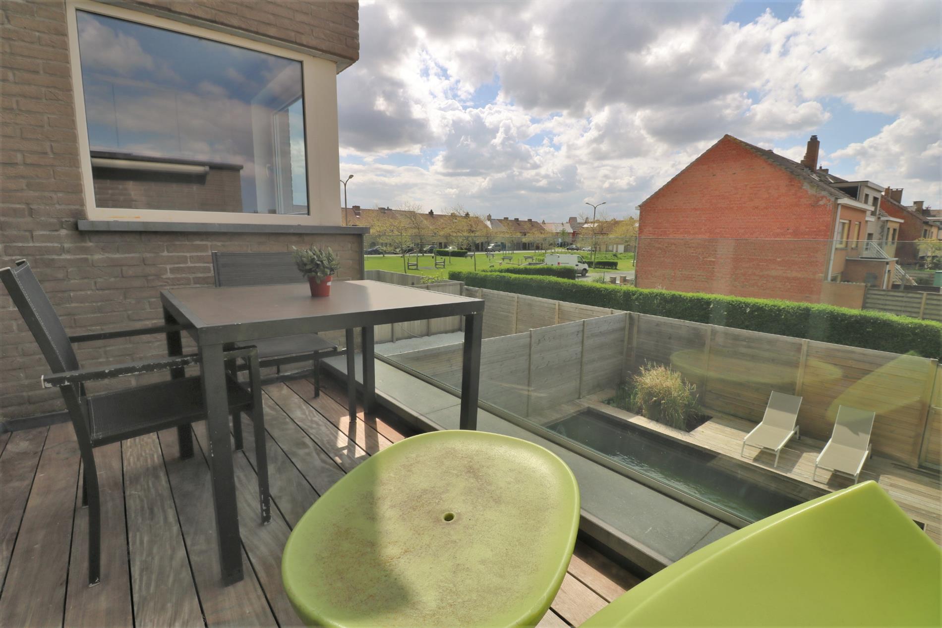 - 1ste verdieping: zeer ruime & luchtige leefruimte (40m²) met aansluitend een mooi zonneterras, half-open volledig geïnstalleerde keuken, berging met gloednieuwe CV brander, 2e toilet;