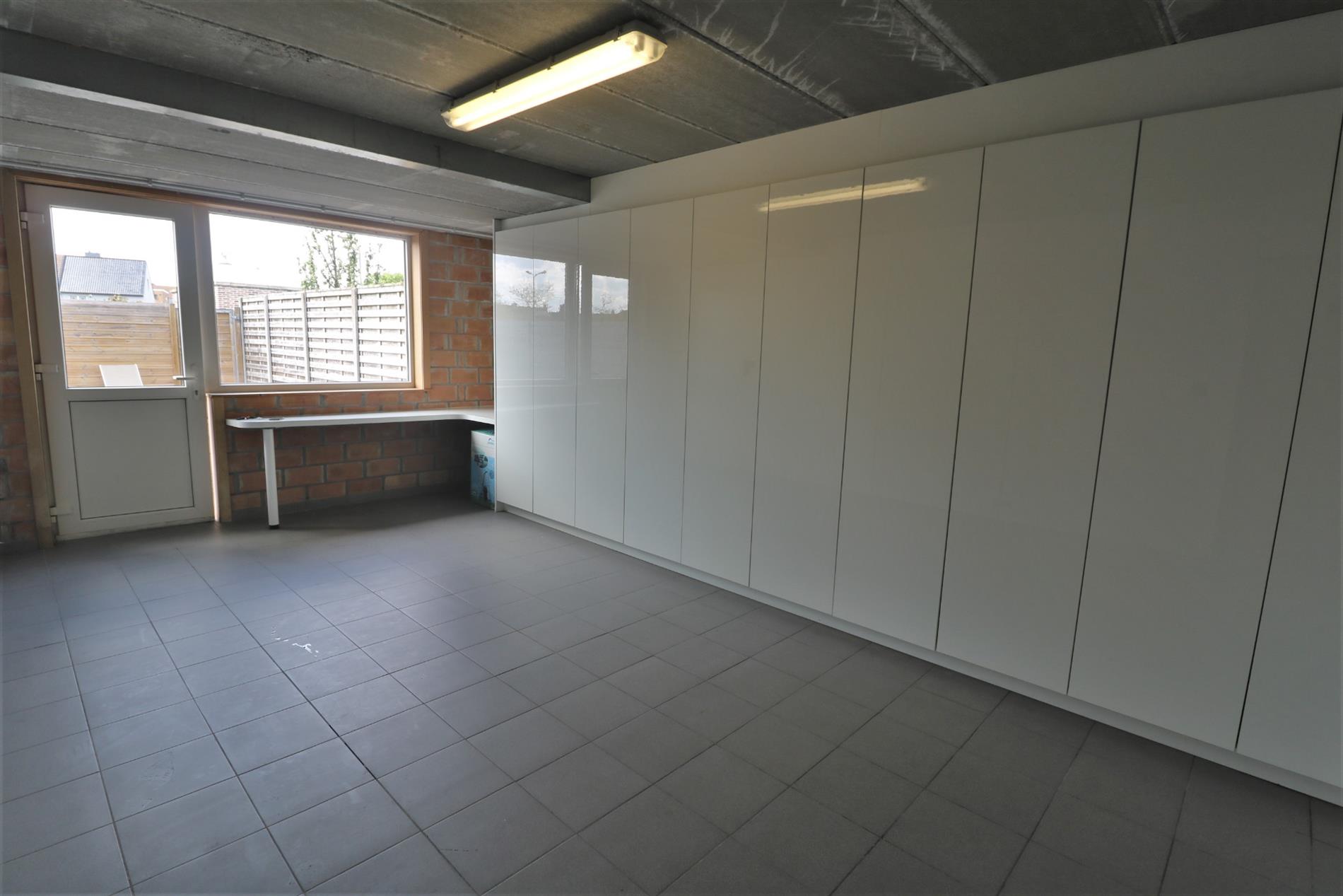 - Gelijkvloers: ruime inkomhal met ingemaakte vestiairekast, gastentoilet, wasplaats, zeer grote ruimte uiterst geschikt voor de uitoefening van een vrij beroep. Deze plaats is bovendien voorzien van ingemaakte kasten over de volledige lengte, verder een garage met sectionaalpoort en een zonnige tuin met zwemvijver;