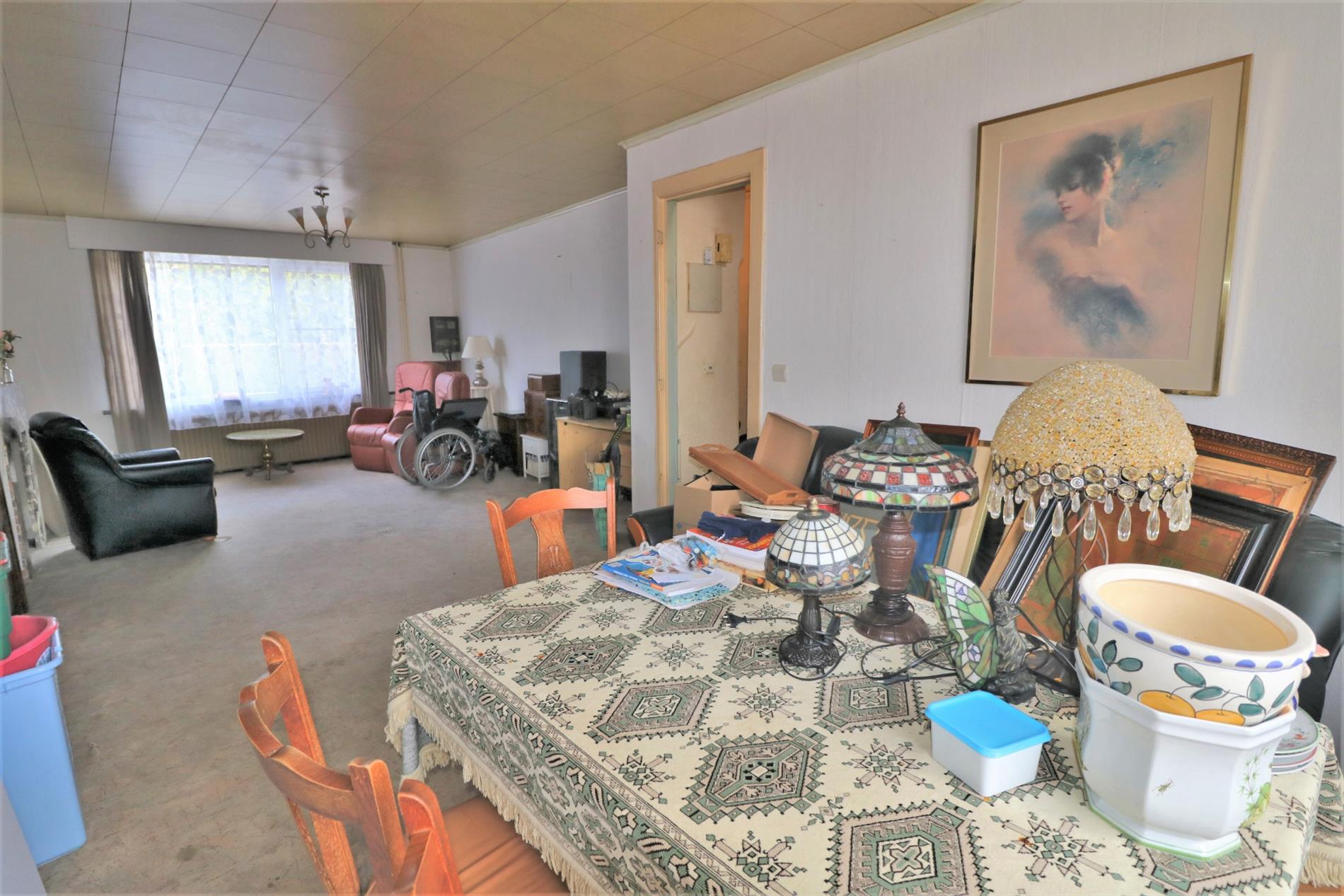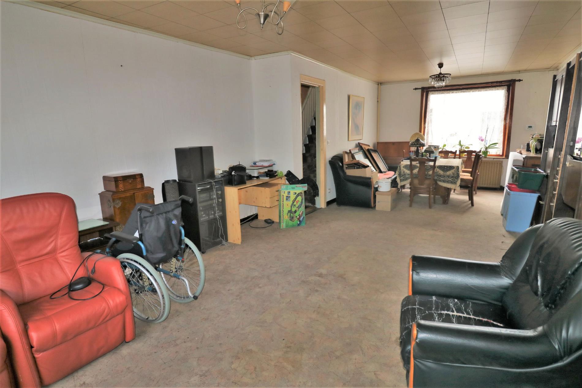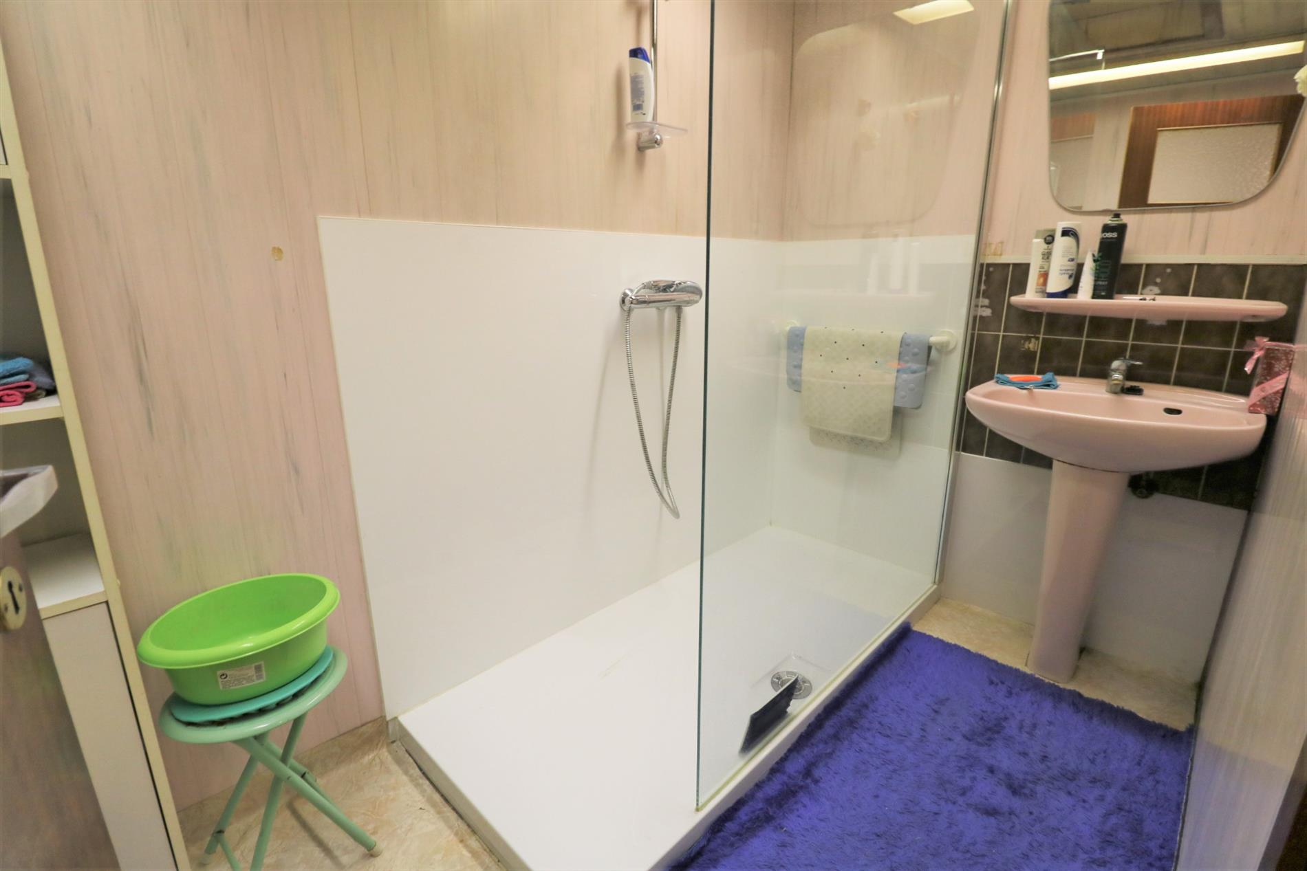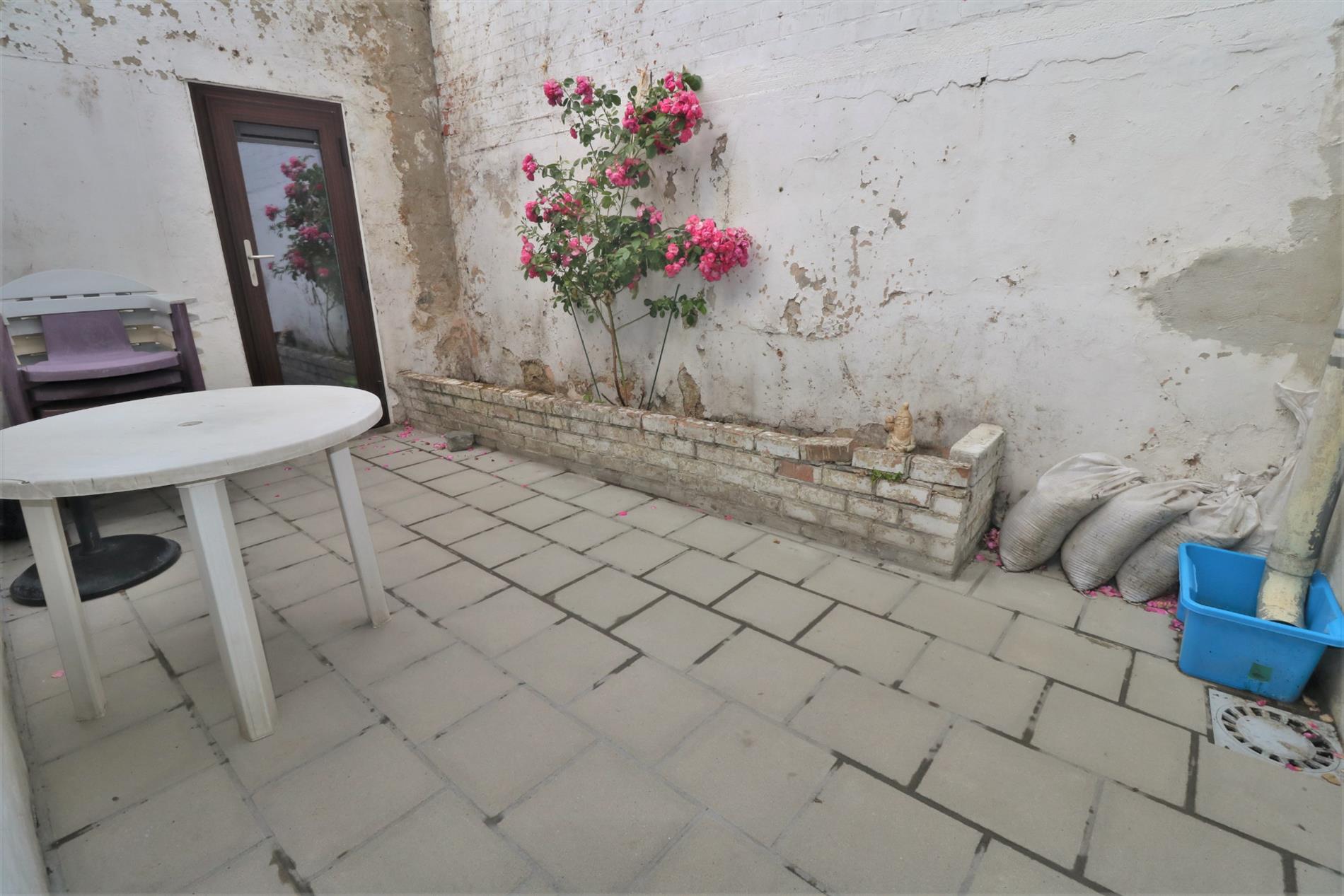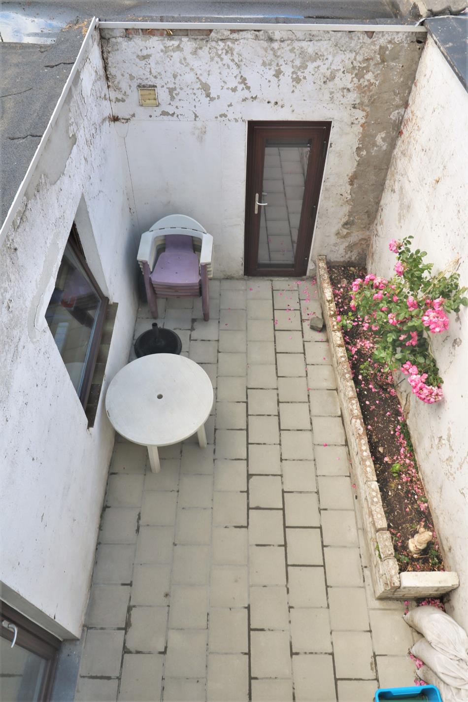 - Gelijkvloers: Inkomhal, ruime en lichtrijke leefruimte, gesloten keuken, badkamer met inloopdouche en lavabomeubel, apart toilet,ruime bergruimte en zonnig koertje;