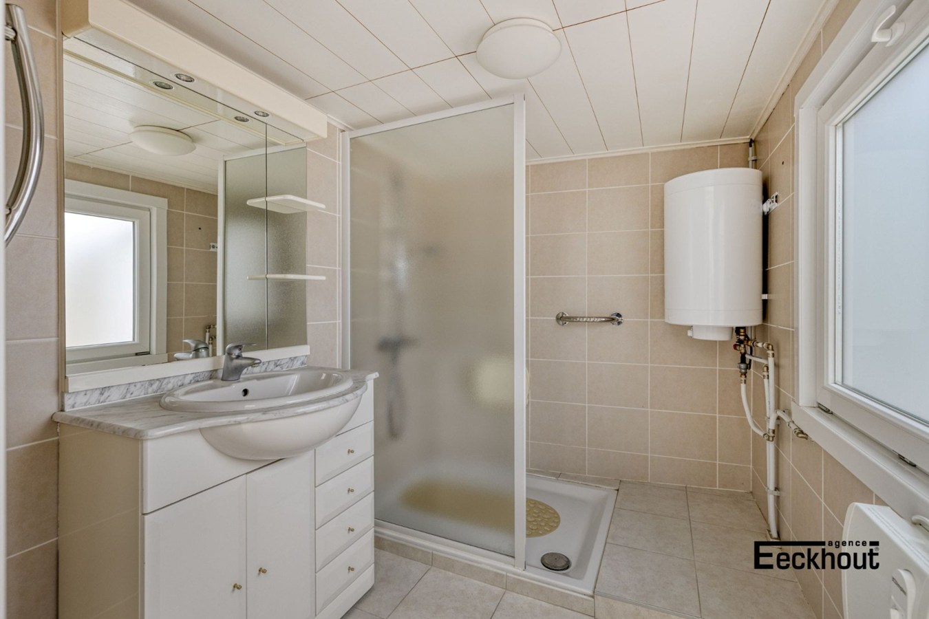 gelijkvloers: brede inkomhal, woonkamer, lichtrijke keuken, bijkeuken/veranda met toegang tot de zonnige koer, badkamer met inloopdouche en lavabomeubel, apart toilet;