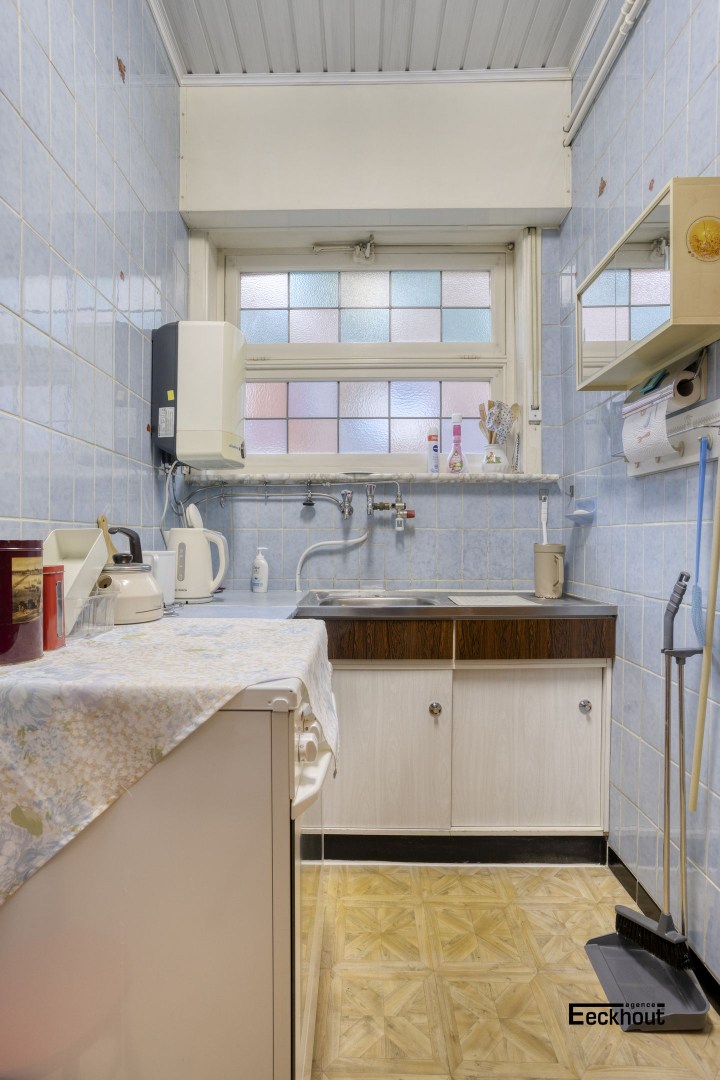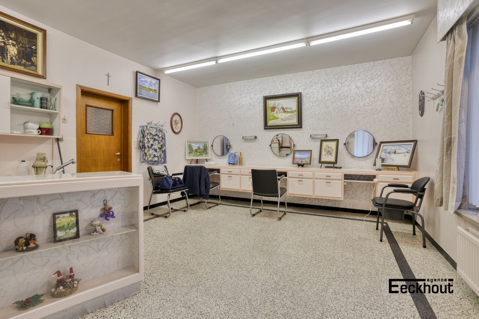 - gelijkvloers: inkomhal, handelsruimte die steeds als kapsalon werd gebruikt, woonkamer, eetkamer, keukentje, veranda, koer en garage;