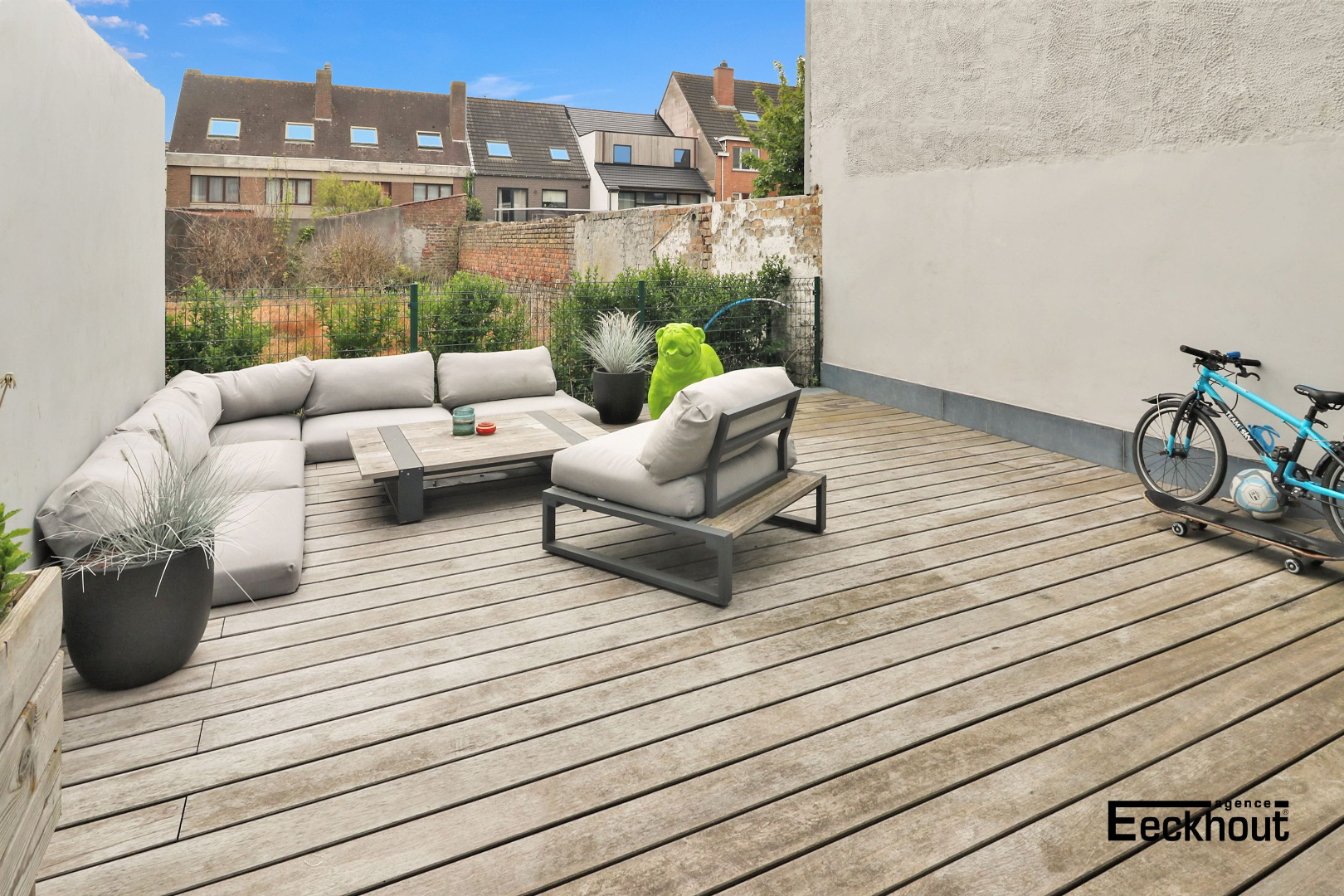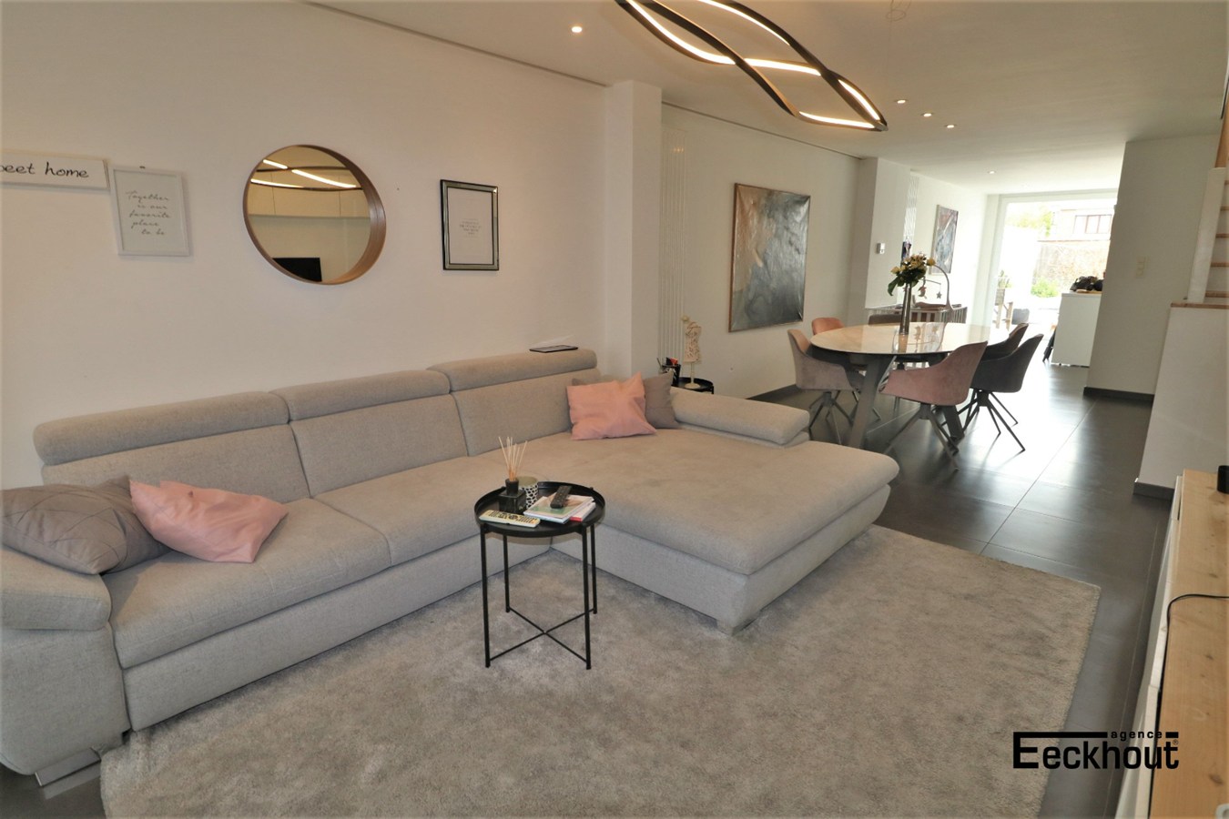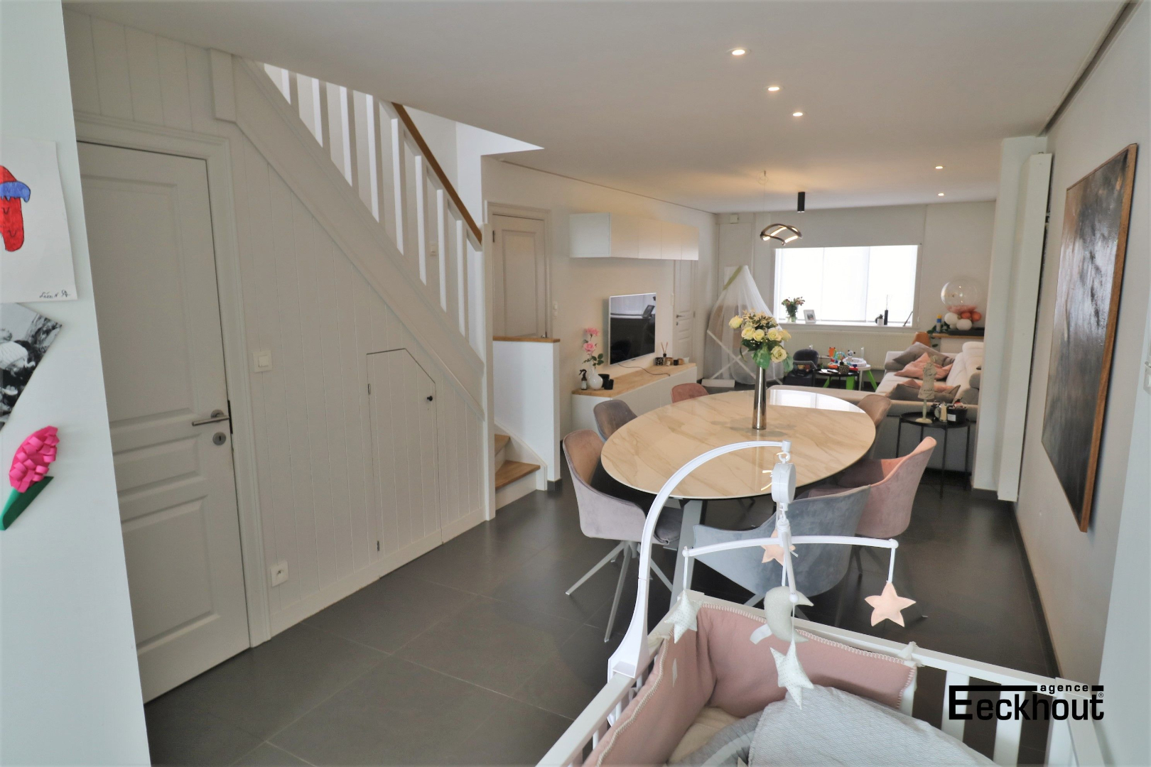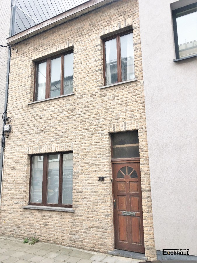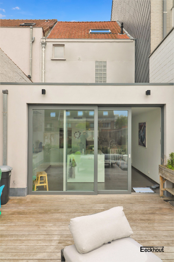 Achter deze bescheiden gevel bevinden zich op het gelijkvloers: inkomhal, ruime en lichtrijke leefruimte met open geïnstalleerde keuken, gastentoilet, berging en zonnig terras;