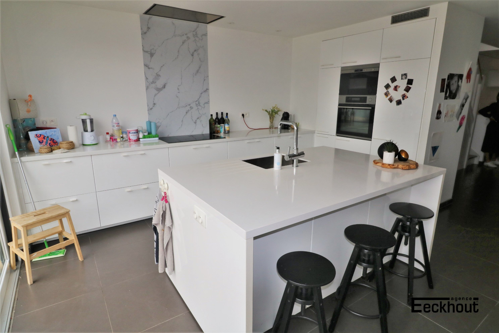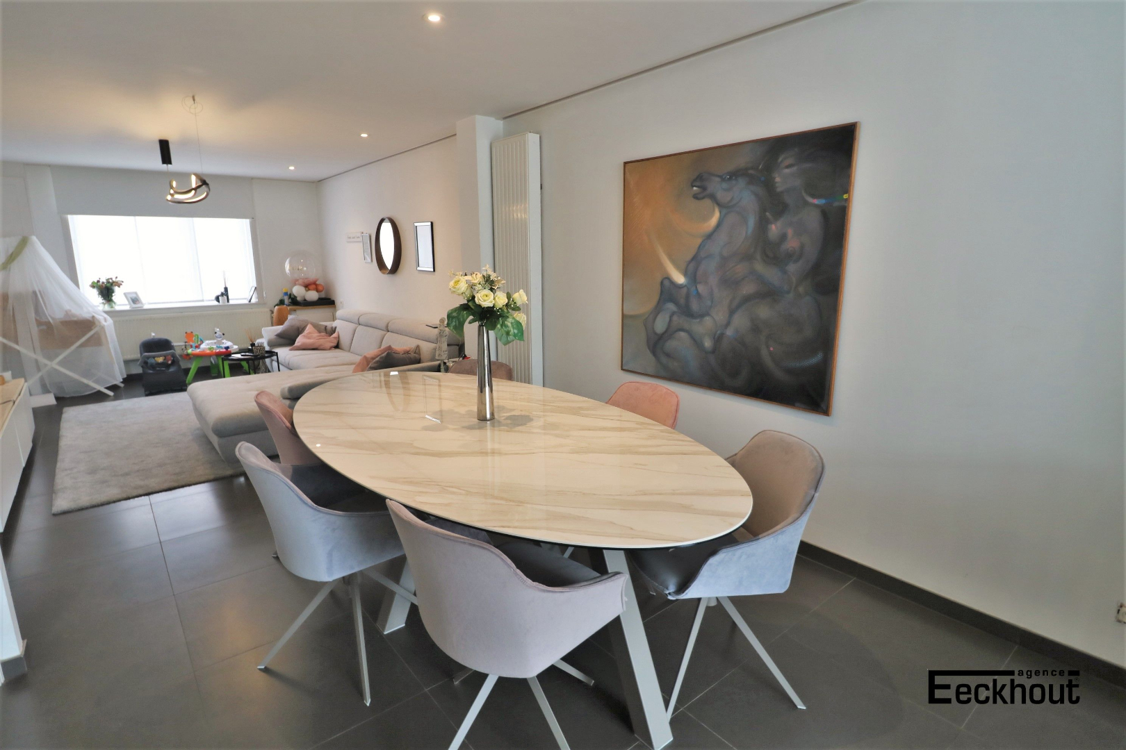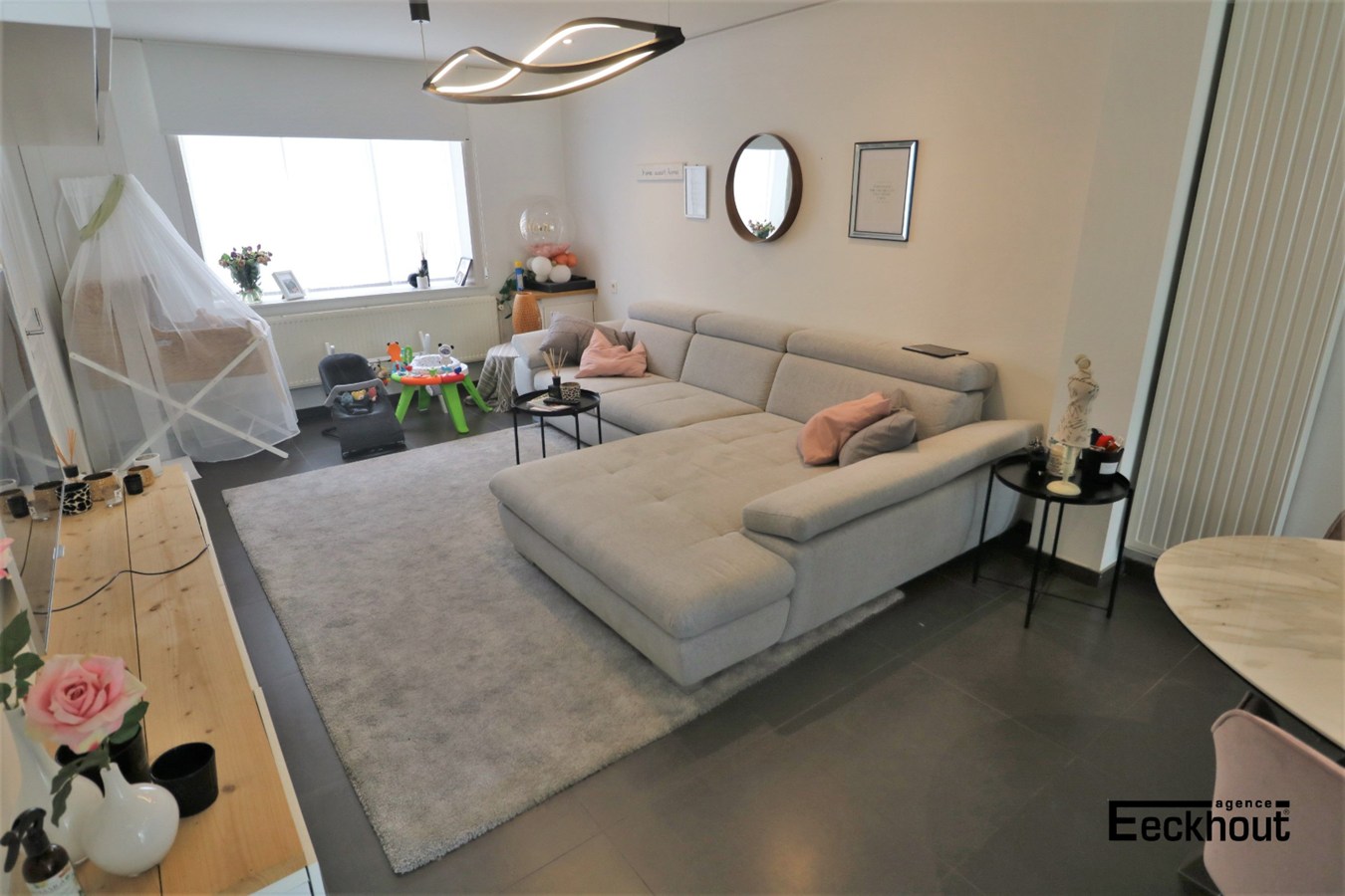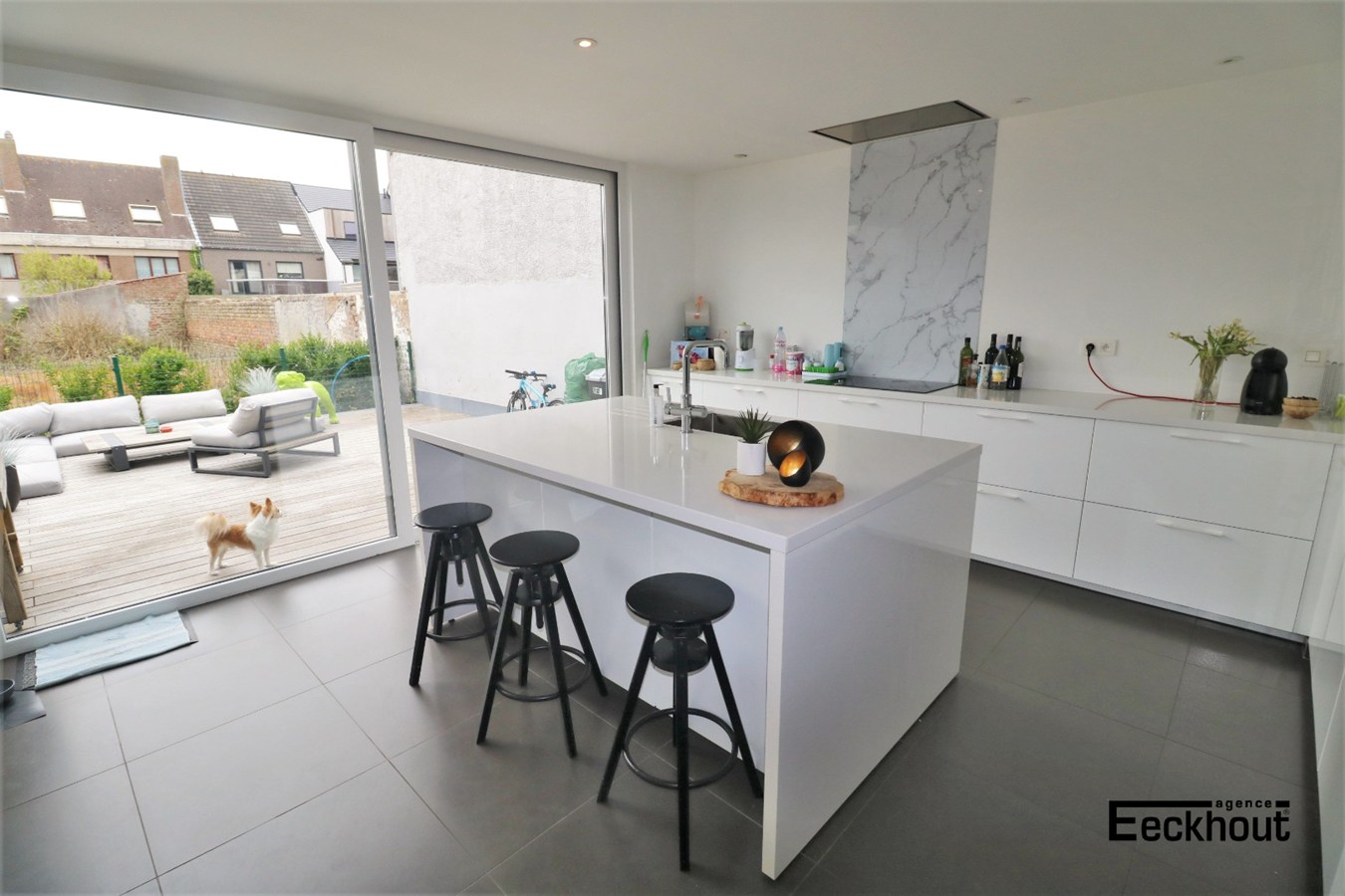 Achter deze bescheiden gevel bevinden zich op het gelijkvloers: inkomhal, ruime en lichtrijke leefruimte met open geïnstalleerde keuken, gastentoilet, berging en zonnig terras;