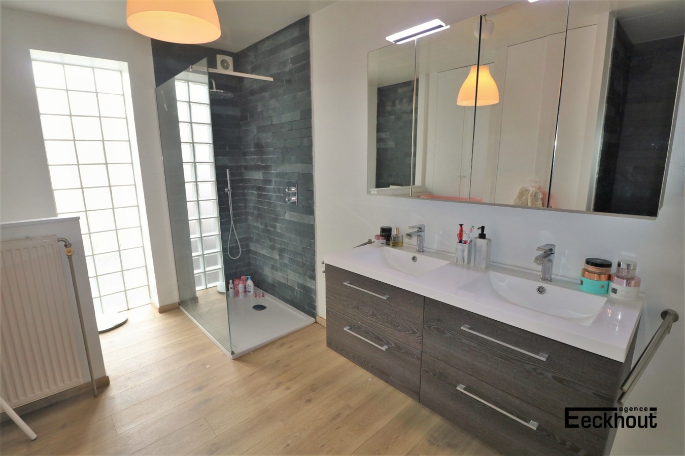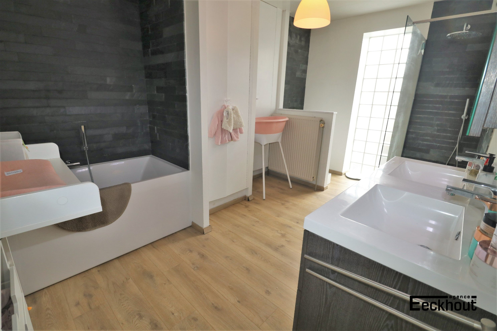 Op de 1ste verdieping: zeer ruime slaapkamer en badkamer met ligbad, inloopdouche, dubbel lavabomeubel en toilet;