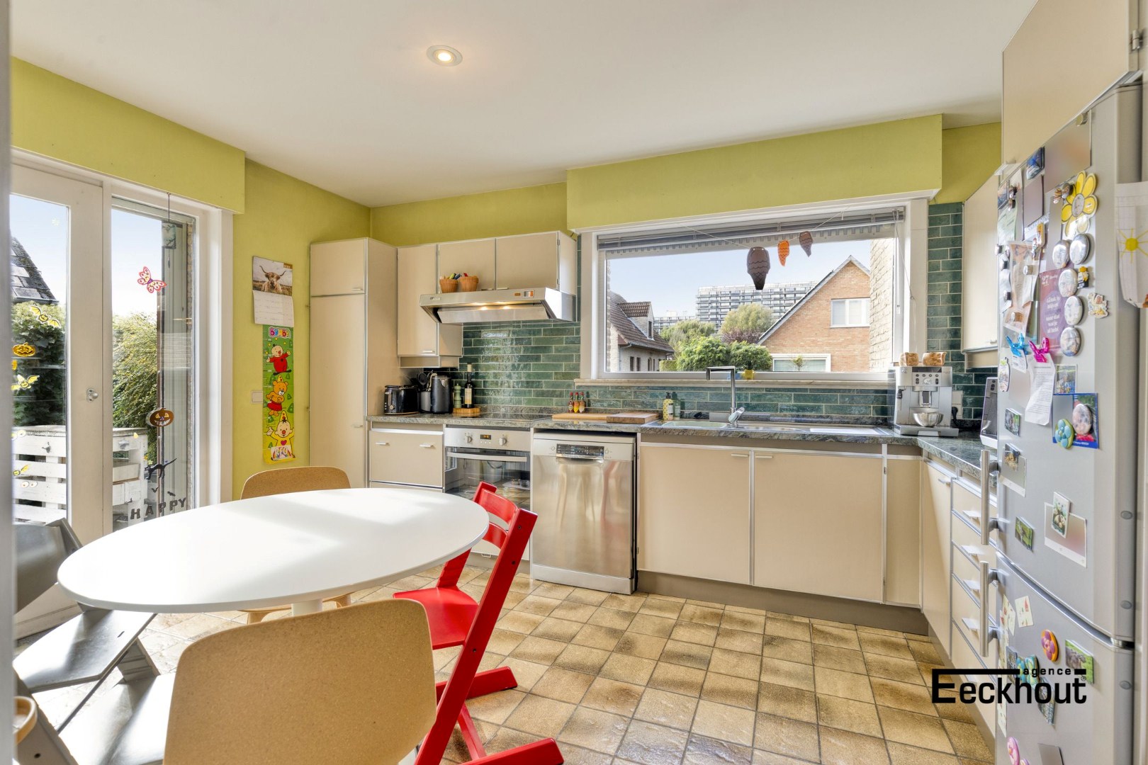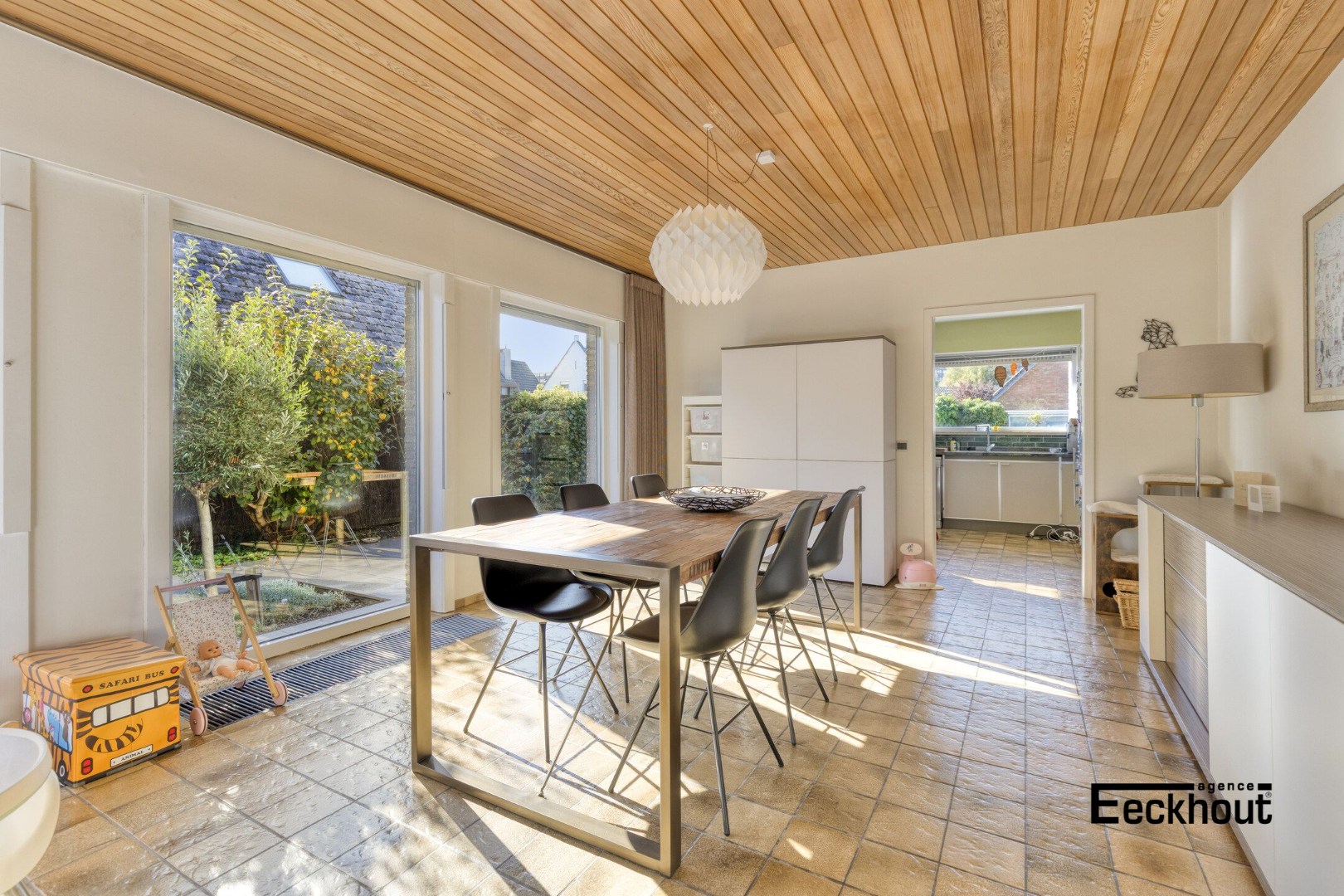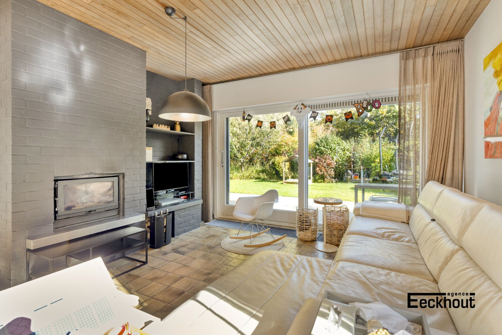 - gelijkvloers: royale inkomhal, ruime en lichtrijke woonkamer met grote raampartijen, met directe toegang tot het recent aangelegde terras en de tuin, aparte keuken met veel kastruimte en natuurstenen werkblad, gastentoilet met lavabo, garage, wasplaats/berging met douche.