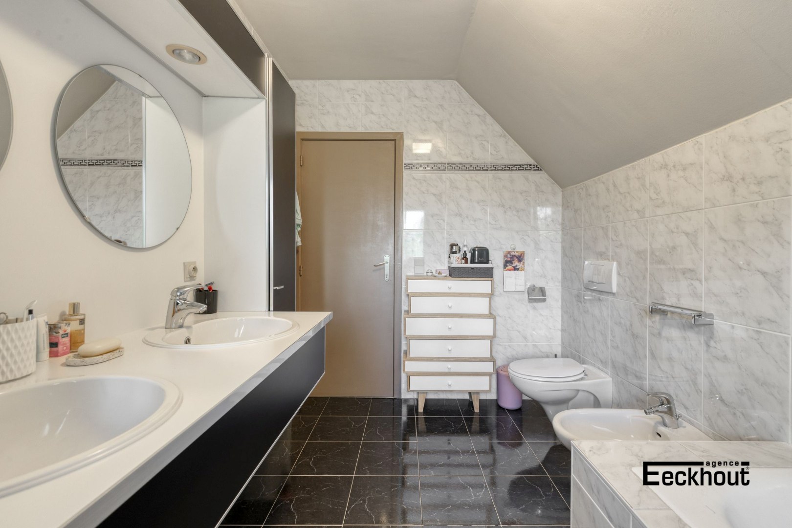 - eerste verdieping: nachthal, 3 grote slaapkamers en 4e slaapkamer die momenteel ingericht is als bureau, badkamer met ligbad, dubbel lavabomeubel, bidet en toilet, bergruimte;