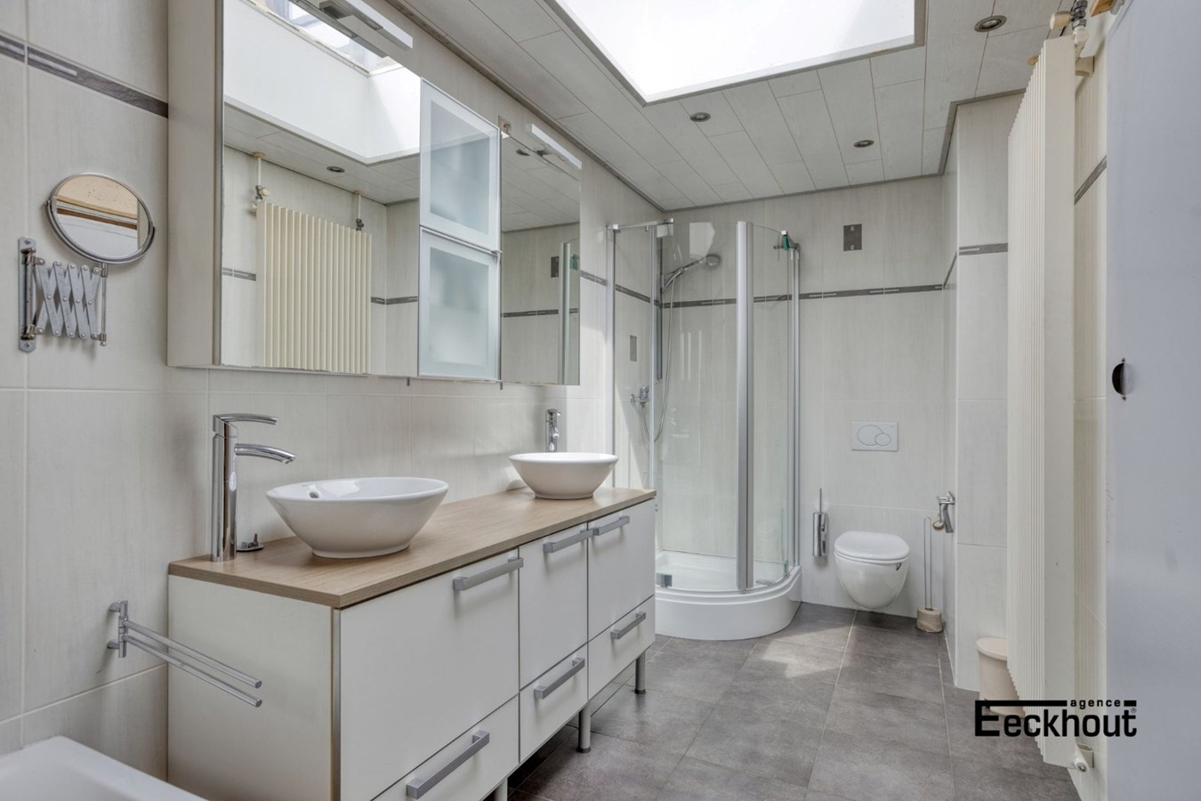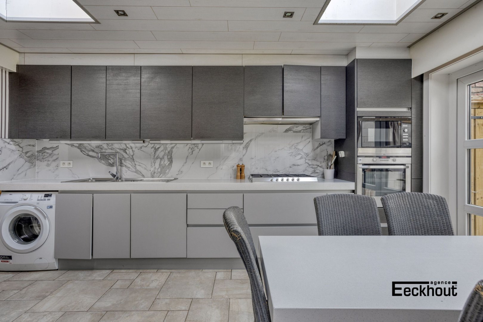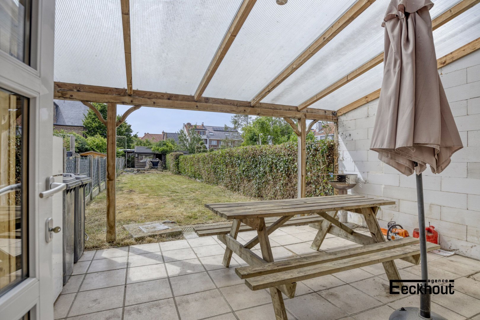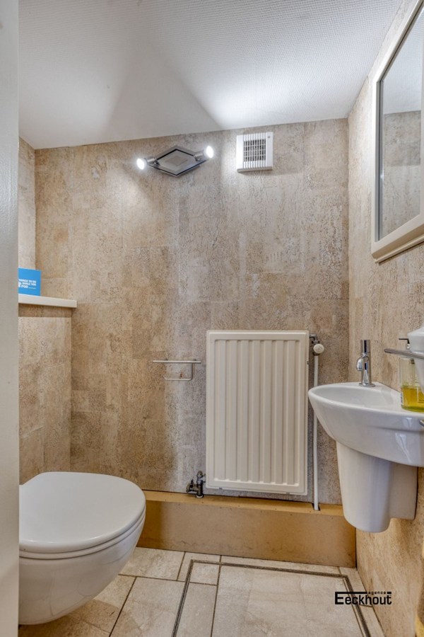 - Op het gelijkvloers: inkomhal, gastentoilet met lavabo, lichtrijke woonkamer bestaande uit zit- en eetplaats, mooie leefkeuken voorzien van alle comfort en veel kastruimte, ruime badkamer met dubbel lavabomeubel, toilet, ligbad en douche, diepe, onderhoudsvriendelijke tuin met overdekt terras en tuinhuis;
