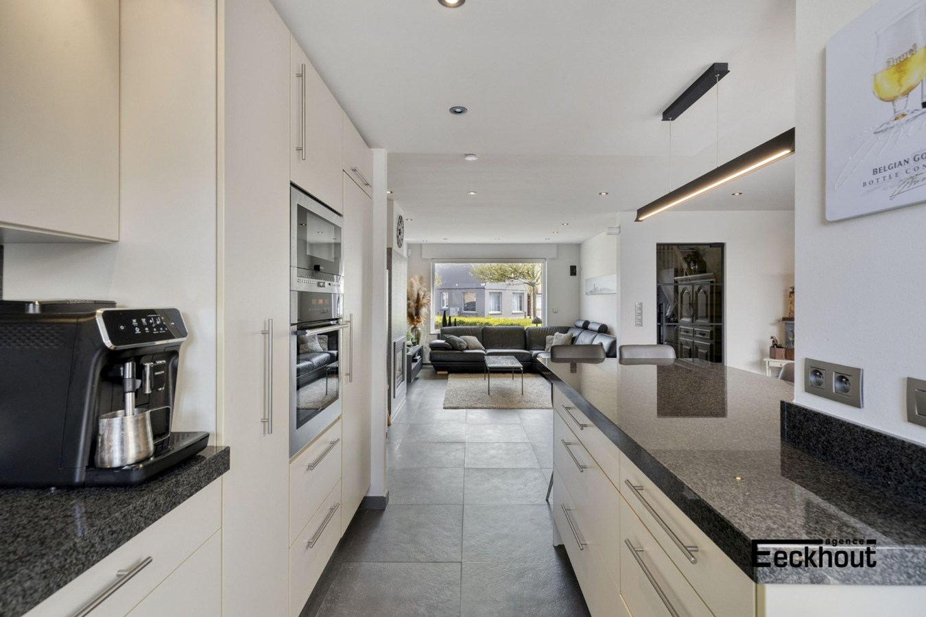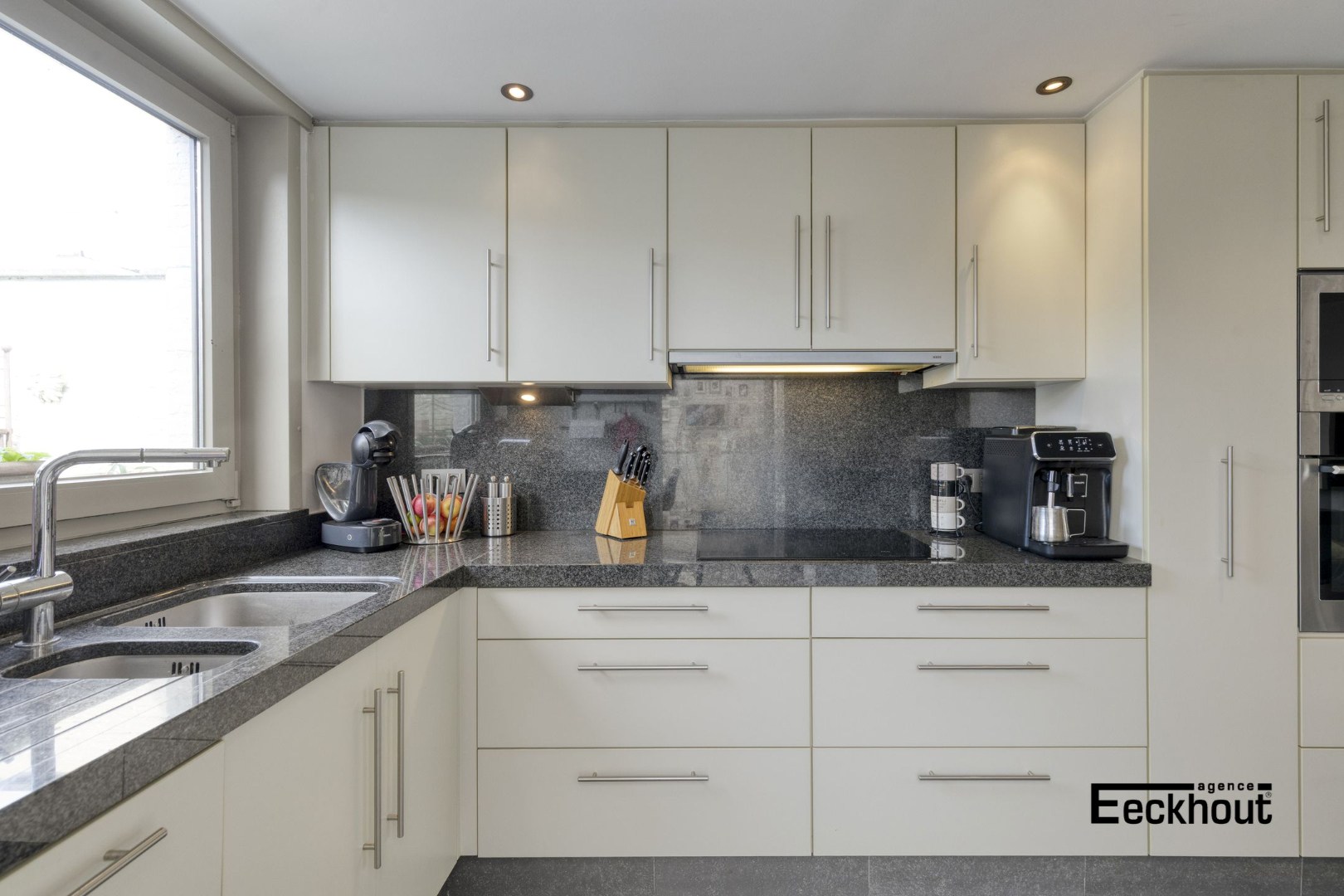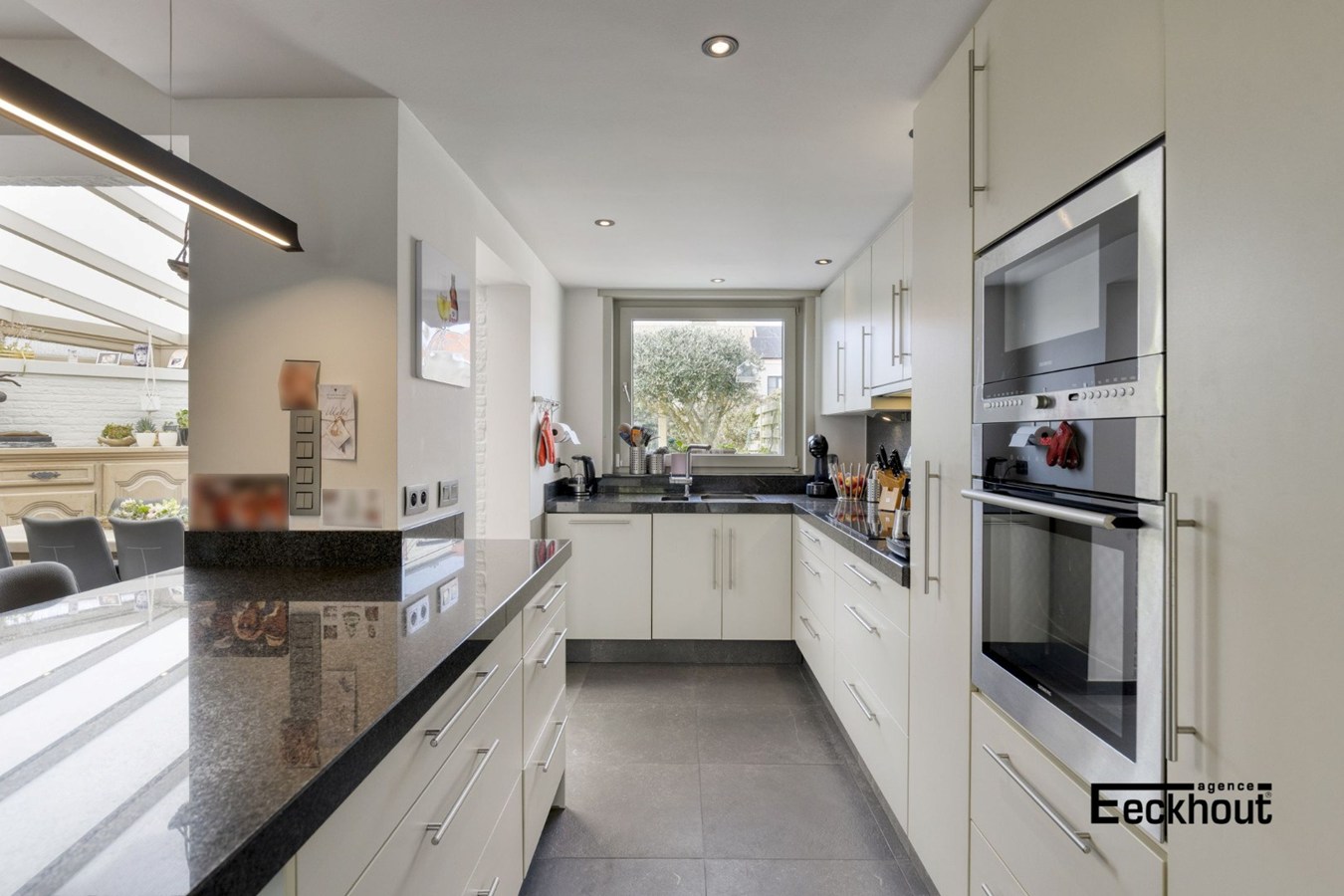 - op het gelijkvloers; inkomhal, zeer ruime en lichtrijke woonkamer bestaande uit eet- en zithoek, open, geïnstalleerde keuken met mooi granieten werkblad, toegang tot de zonnige en onderhoudsvriendelijke tuin (met uitweg achteraan de woning), berging met aansluiting voor wasmachine;